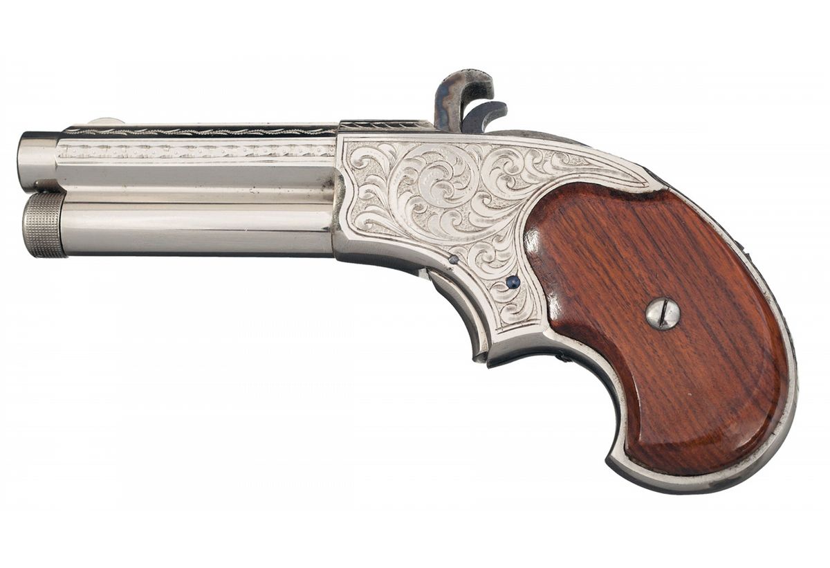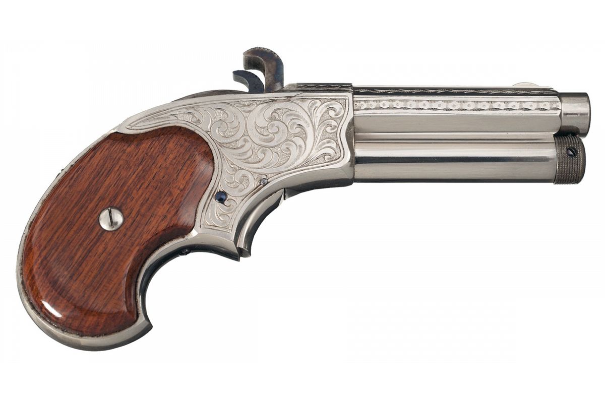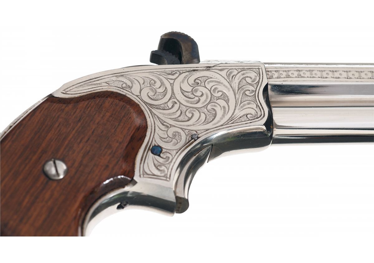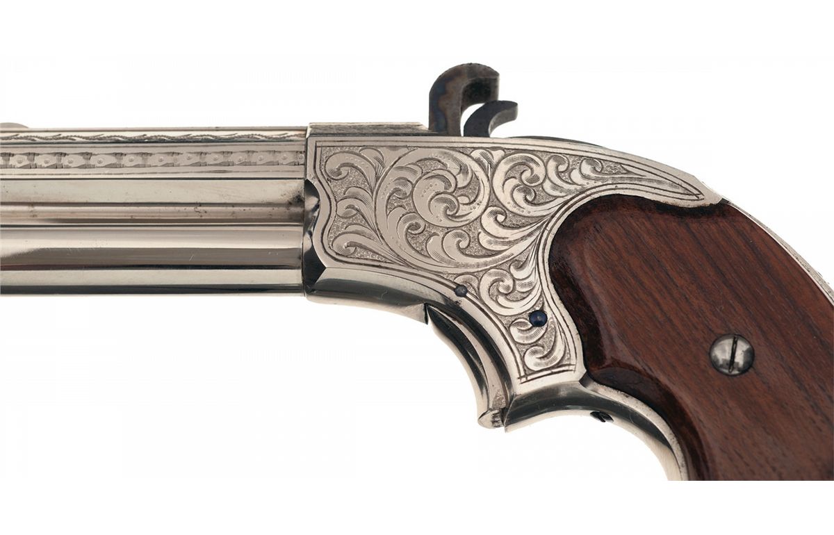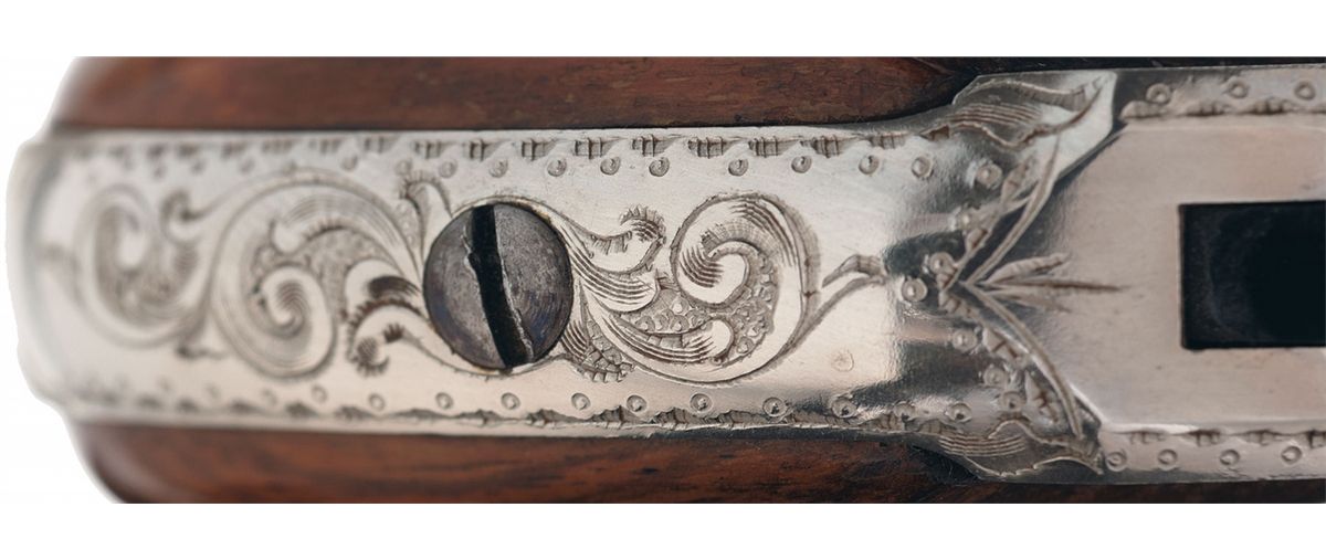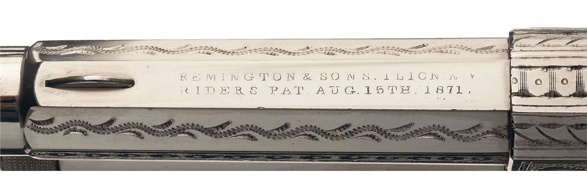 Manufactured between 1871 and 1888, the Remington-Rider is one of the few pistol designs to use a tubular magazine, which front-loads in the style of the Volcanic or Henry rifle. Blade and breechblock mounted peep sights, with "E. REMINGTON & SONS, ILION, N.Y./RIDERS PAT. AUG. 15, 1871." on the top barrel flat, silver finished checkered magazine cap and checkered hammer and breechblock spur. Zig zag engraving is visible on the upper flats of the barrel, with punch dot backed scroll engraving on the sides of the frame and the backstrap. Smooth two piece rosewood grips.