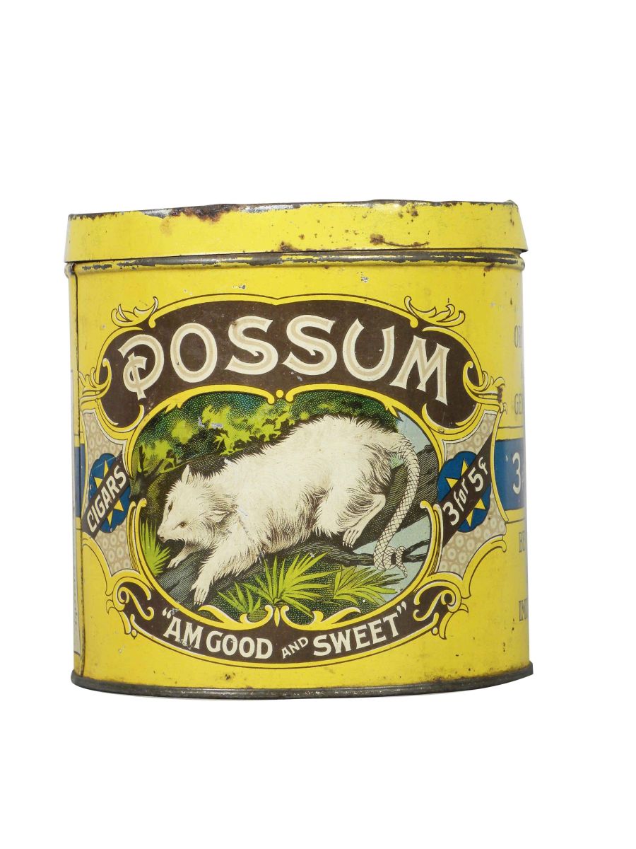 Possum Cigar Tin, 3 for Five Cents. Rare yellow version. Factory 50's. A few dents , minor rust and scratches otherwise good condition. 5 X 5 inches.