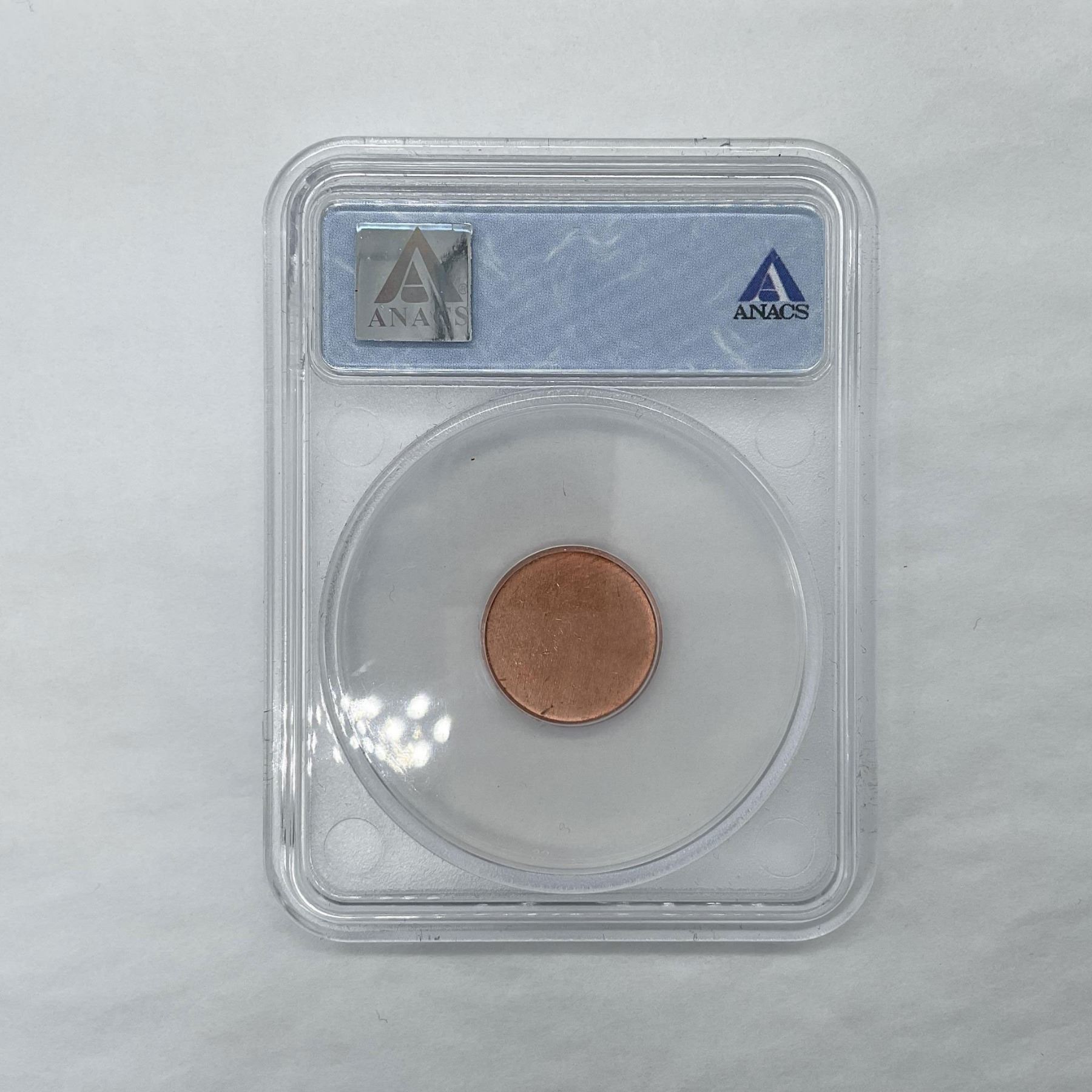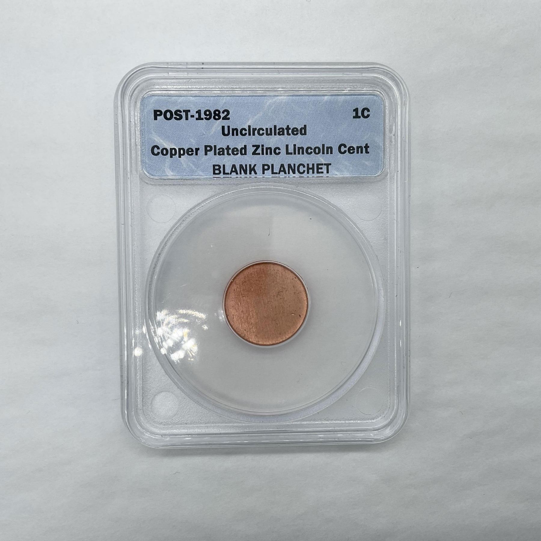 ANACS Slabbed and Authenticated. A Copper Plates Zinc Lincoln Cent. Blank. The coin is in a protective case. The case is approximately: 2.5"L x 0.5"W x 3.25"H.