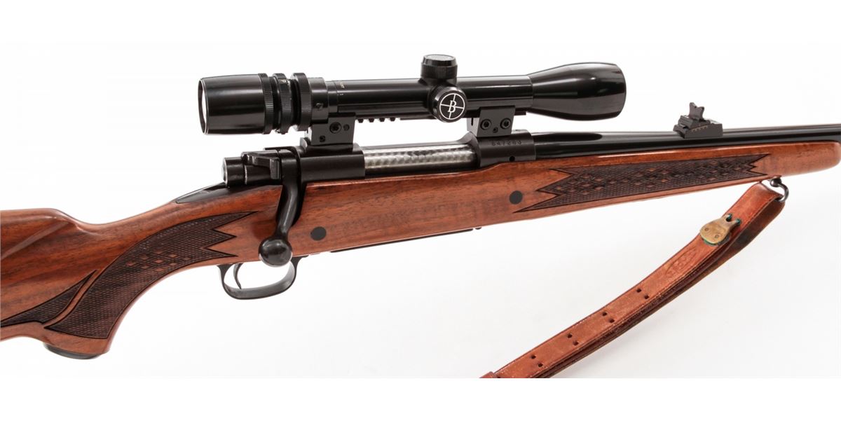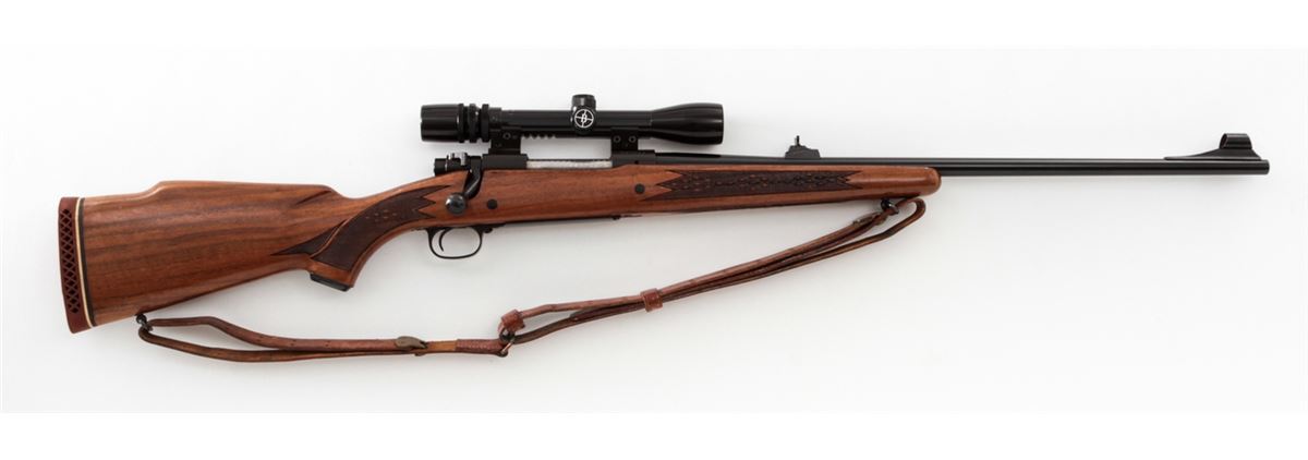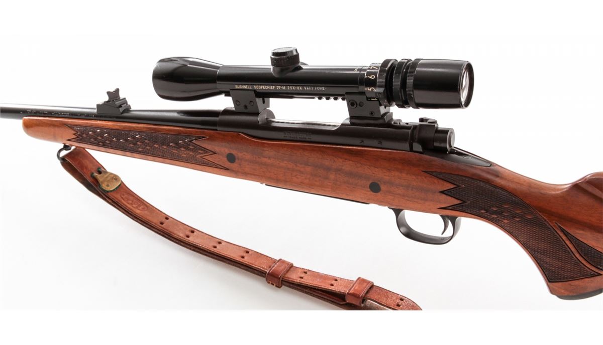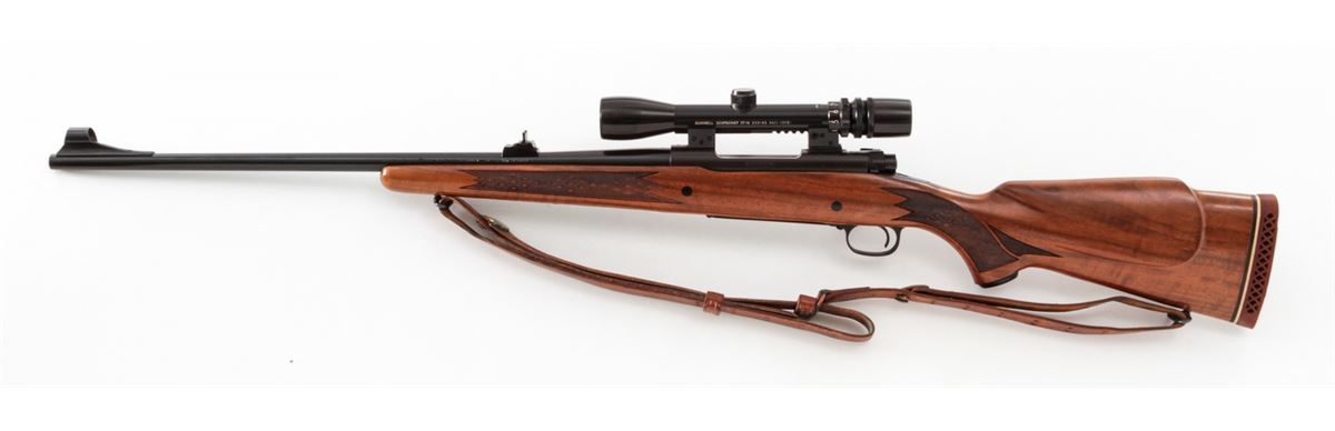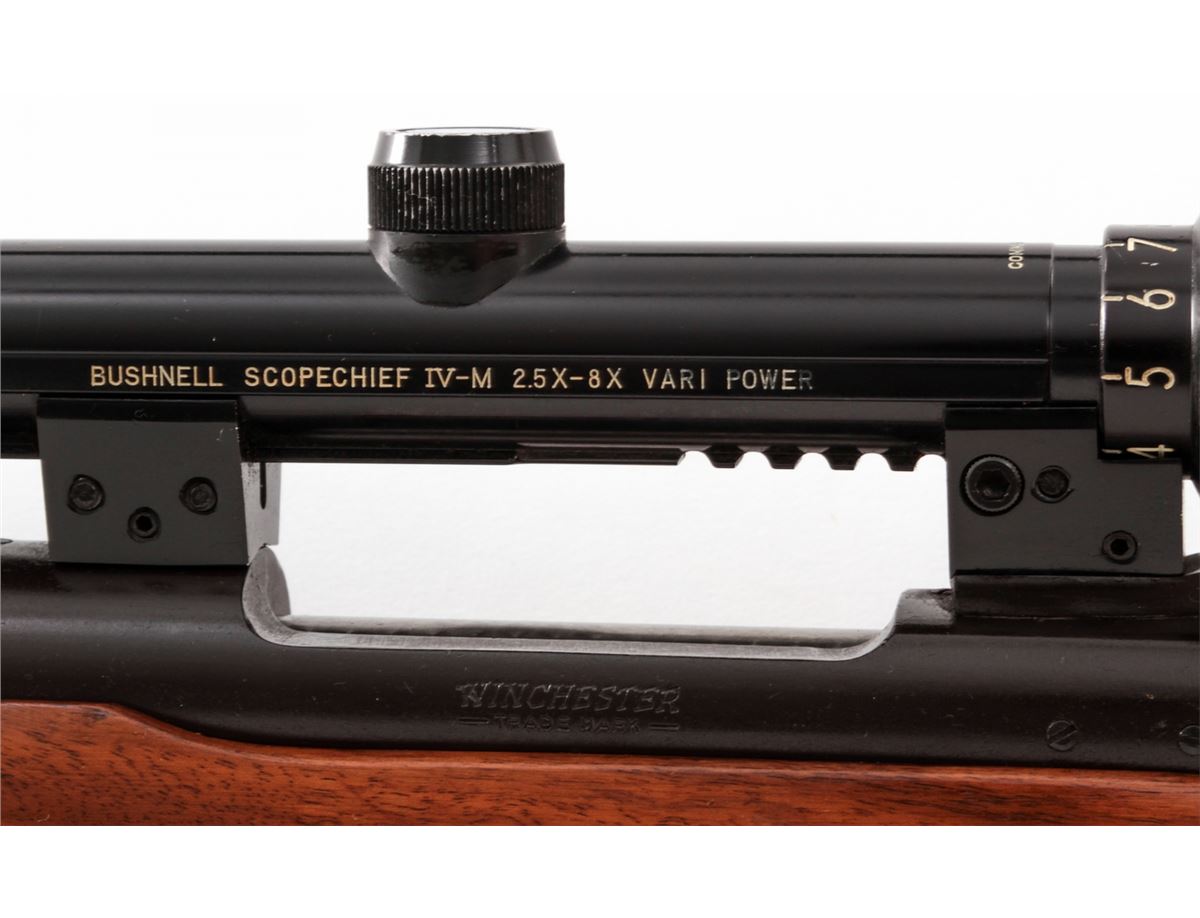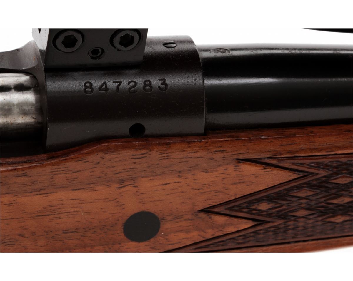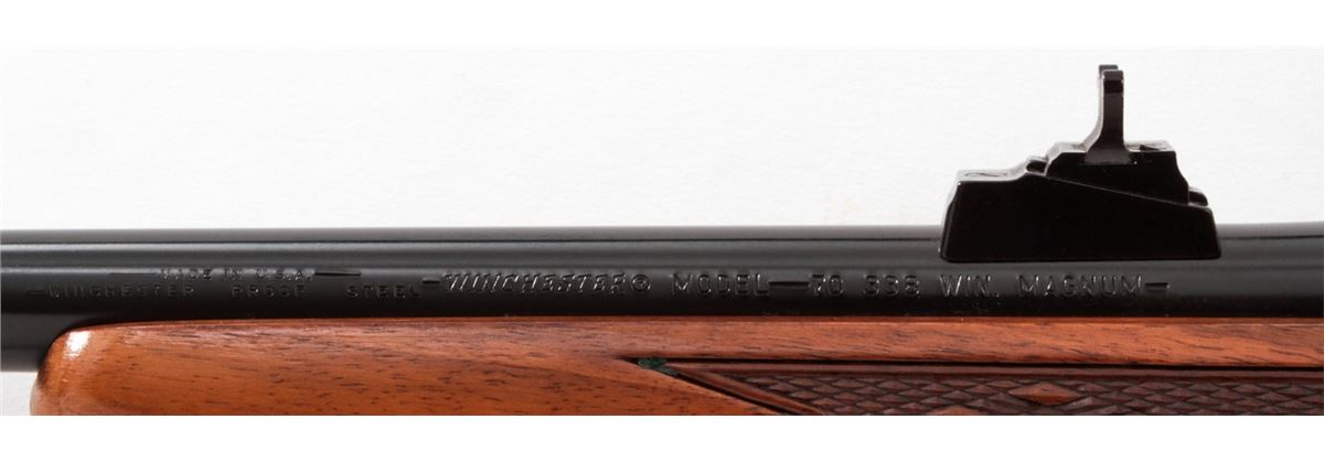Post-64 Winchester Model 70 Bolt Action Rifle, #847283, .338 Win. mag. cal., 24'' barrel, blue finish, pressed checkered walnut stock and Winchester factory butt pad, with commercial leather sling. Topped with a Bushnell 2.5-8 Scope Chief scope on Weaver mounts. Factory iron sights are present as well. Condition is excellent showing just light field use. Stock with minor marks from handling. Good action, bright bore, good optics with crosshair reticles. Est.: $500-$750. (Modern)