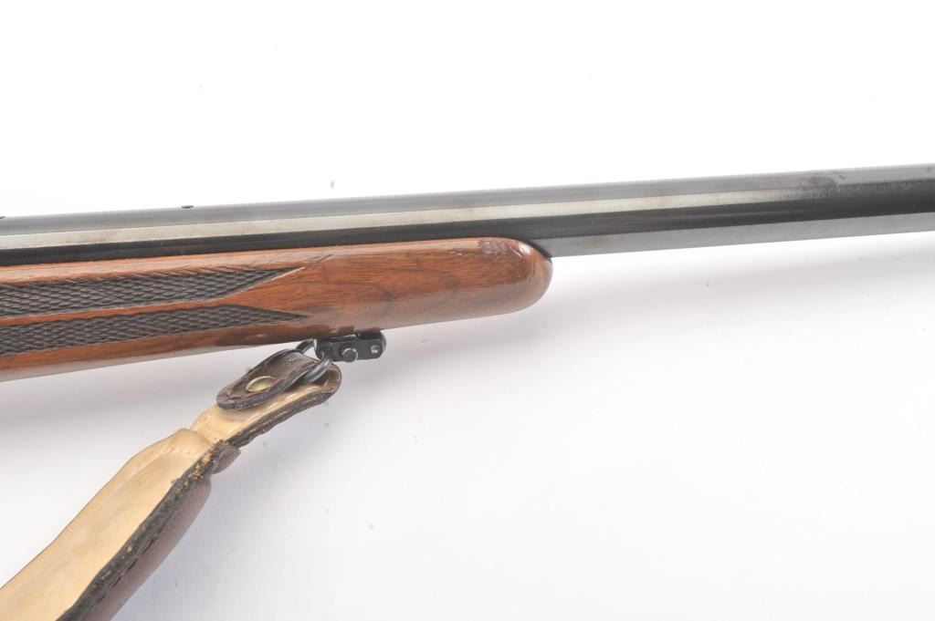 Post-64 Winchester Model 70 bolt action sporting rifle, .375 H&H caliber, Serial #740728. The rifle is in fine overall condition with a 24” barrel with a hooded blade front and the rear sight has beenremoved. The barrel retains the majority of the factory blue finish with only light handling marks. The finely checkered Walnut stock is in very good condition with custom checkering and a ventilated rubber recoilpad. Sling swivels and a period leather sling have been added during the period of use. The rifle is topped with a Redfield one-piece mount and rings with a Tasco 4 x 12 variable power scope. The bore is good,the action is crisp and the markings are sharp on this M70 Super Grade. Est.: $750-$1,500. (C+R).