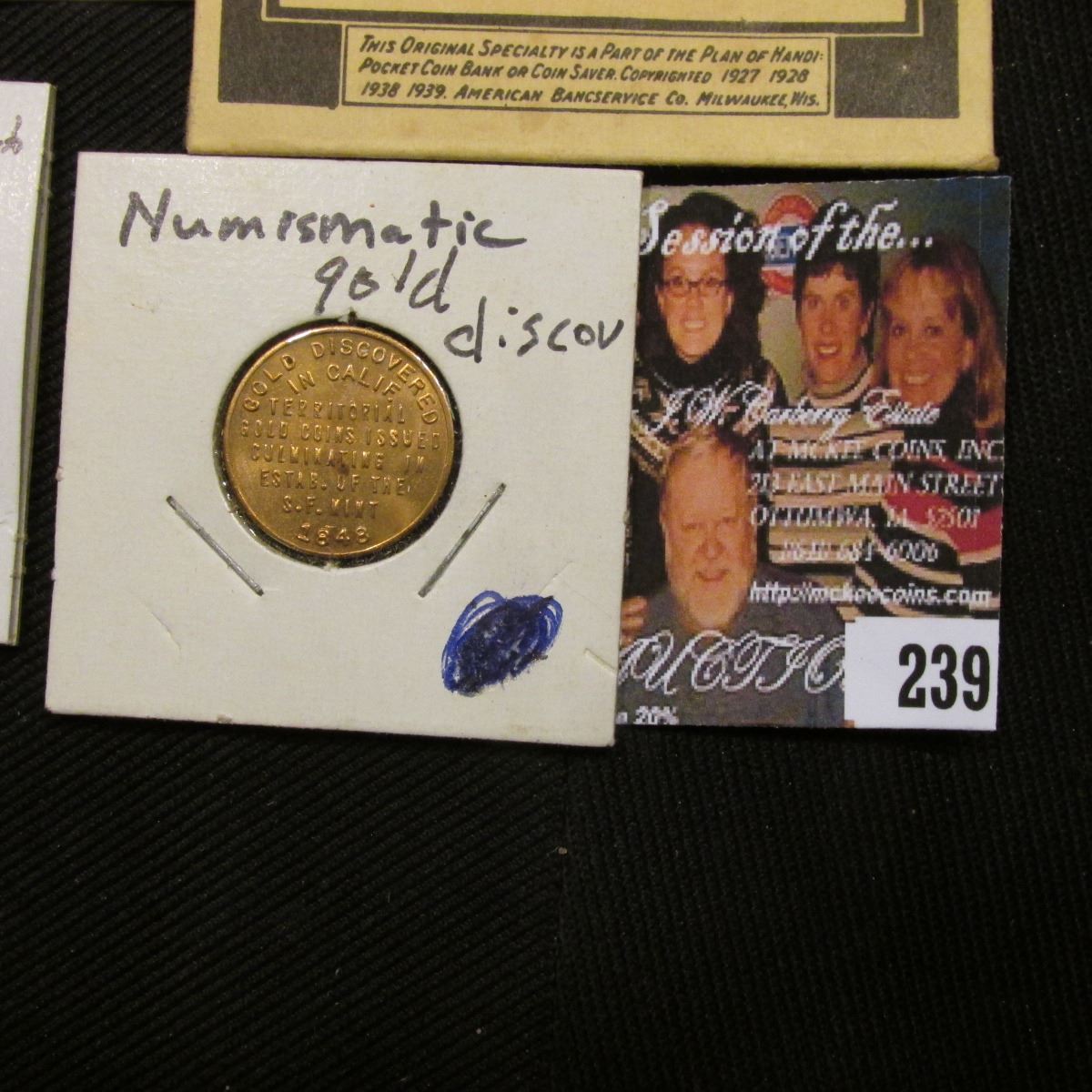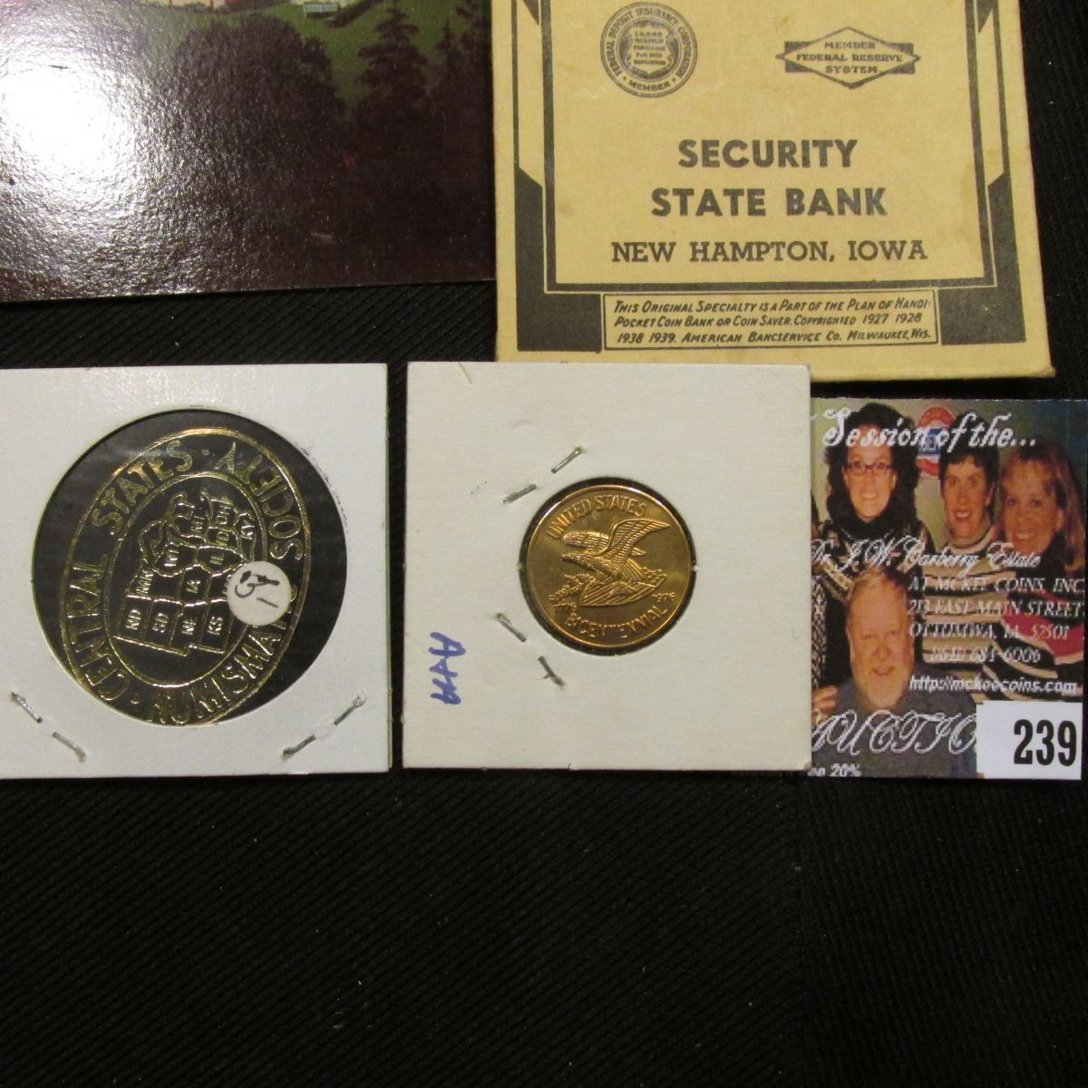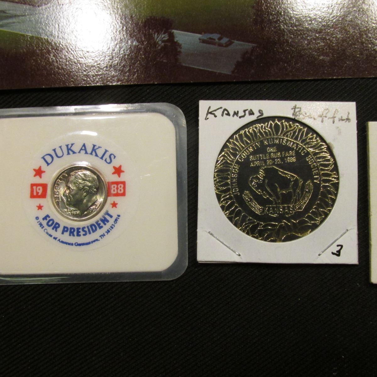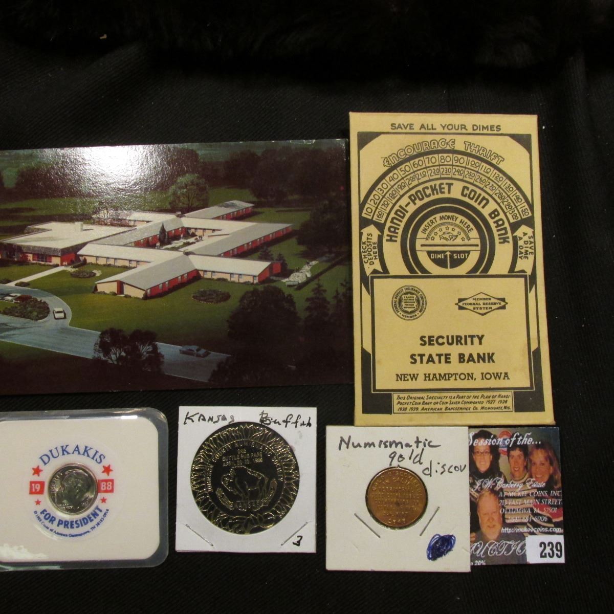 Post Card "Bethesda Home of Aberdeen"; 1988 D "Dukakis For President: Encased Roosevelt Dime; "Jordan County Numismatic Society One Shuttle Bus Fare April 20-23, 1989" CSNS Kansas Buffalo Token; "Save All Your Dimes Handi-Pocket Coin Bank Security State Bank, New Hampton, Iowa"; & "United Bicentennial", "Gold Discovered In Calif.Territorial Gold Coins Issued Culminating in Estab. of the U.S. Mint 1848".