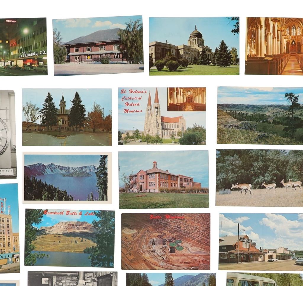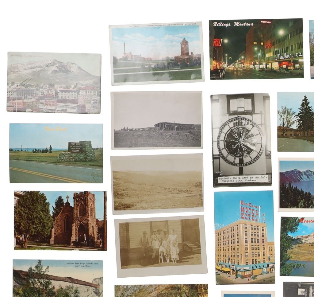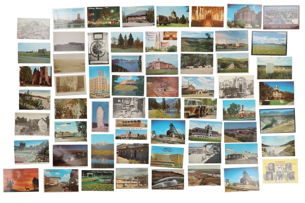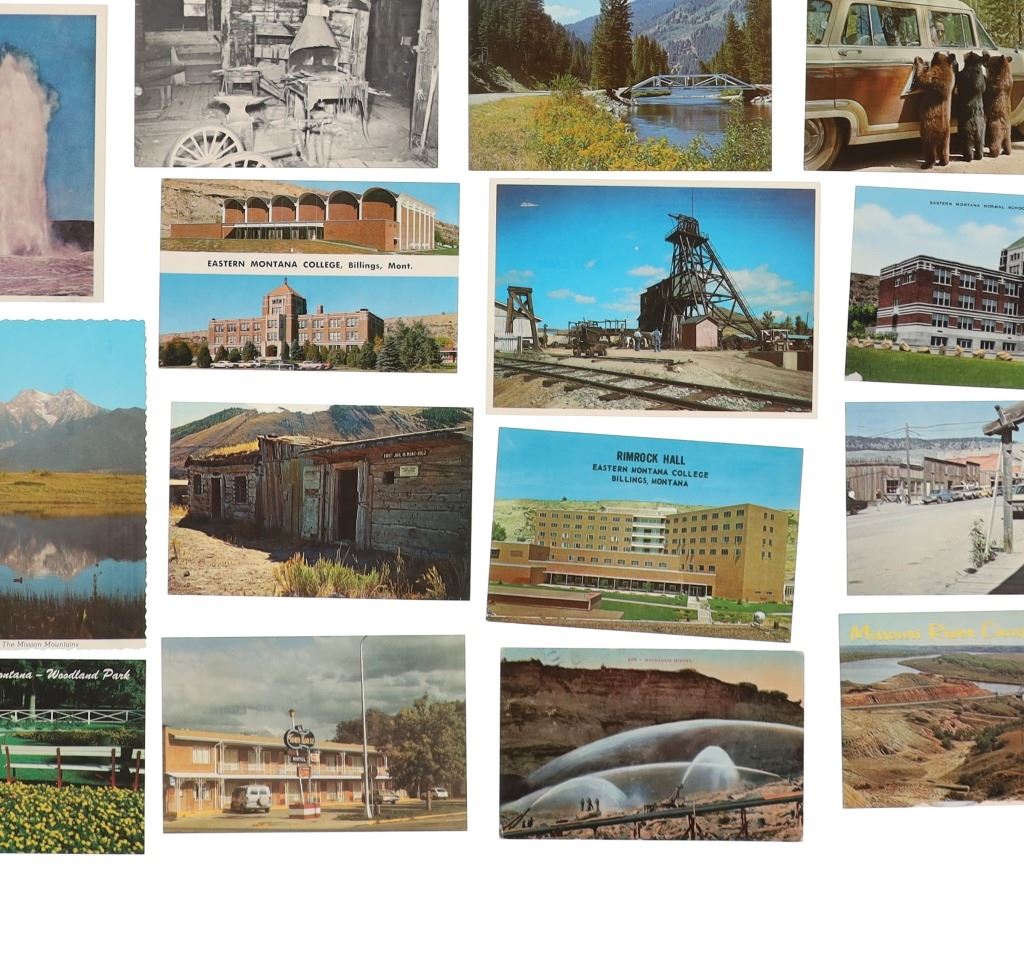 Featured in this lot are seventy-three post cards and real photo post cards from various locations around Montana circa Early / Mid 20th Century. This lot contains nine real photo post cards and sixty-four post cards from various locations such as Missoula, Glacier National Park, Helena, Hungry Horse Dam, Gallatin River, West Gallatin River, Lewis & Clark Caverns, The Lady of the Rockies, Hell Roaring Gulch, The Berkeley Pit, Lewistown, Custer Battlefield, The Bear Paw Mountains, Butte, Billings, Fort Peck, Virginia City, Kalispell, The Mission Mountains, Livingston, Bozeman, Yellowstone National Park, Crater Lake, Beartooth Butte, The Hysham Hills, Wibaux, Missouri River, Bannack and Great Falls. The post cards show good condition overall with slight wear present from their age and handling over the years, but no major signs of damage are noted. They measure from 4 1/4" L x 6" W to 3 3/8" L x 5 3/8" W. They have a collective weight of 8 ounces.