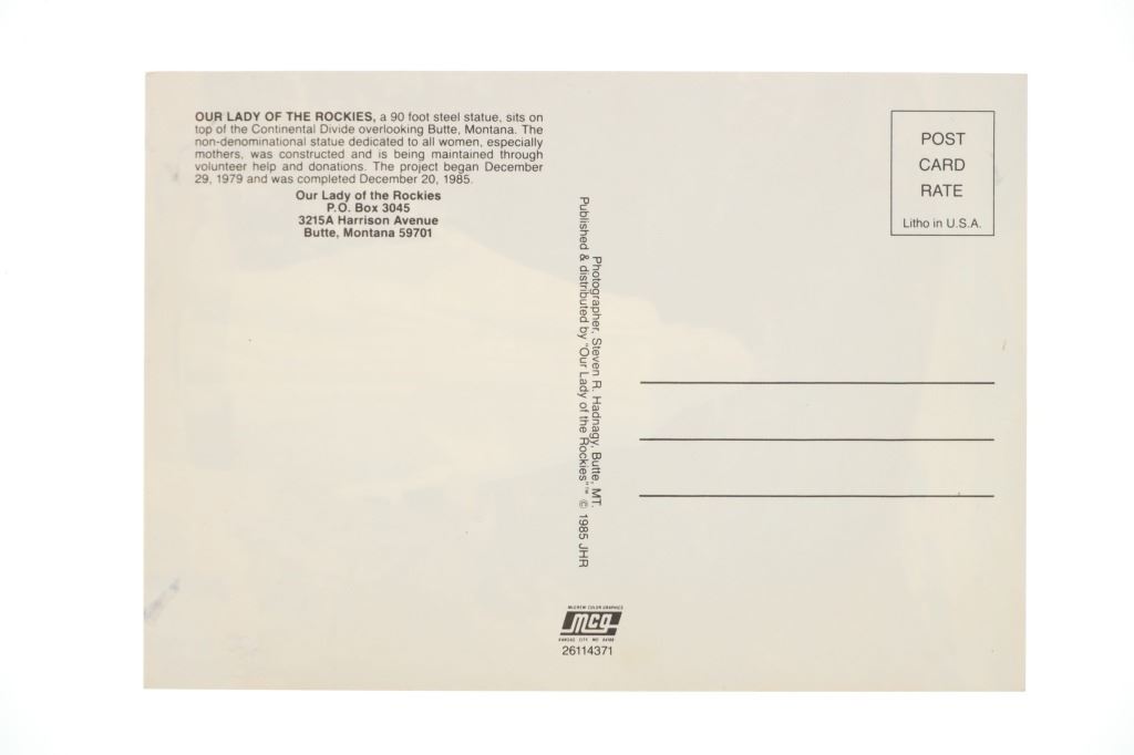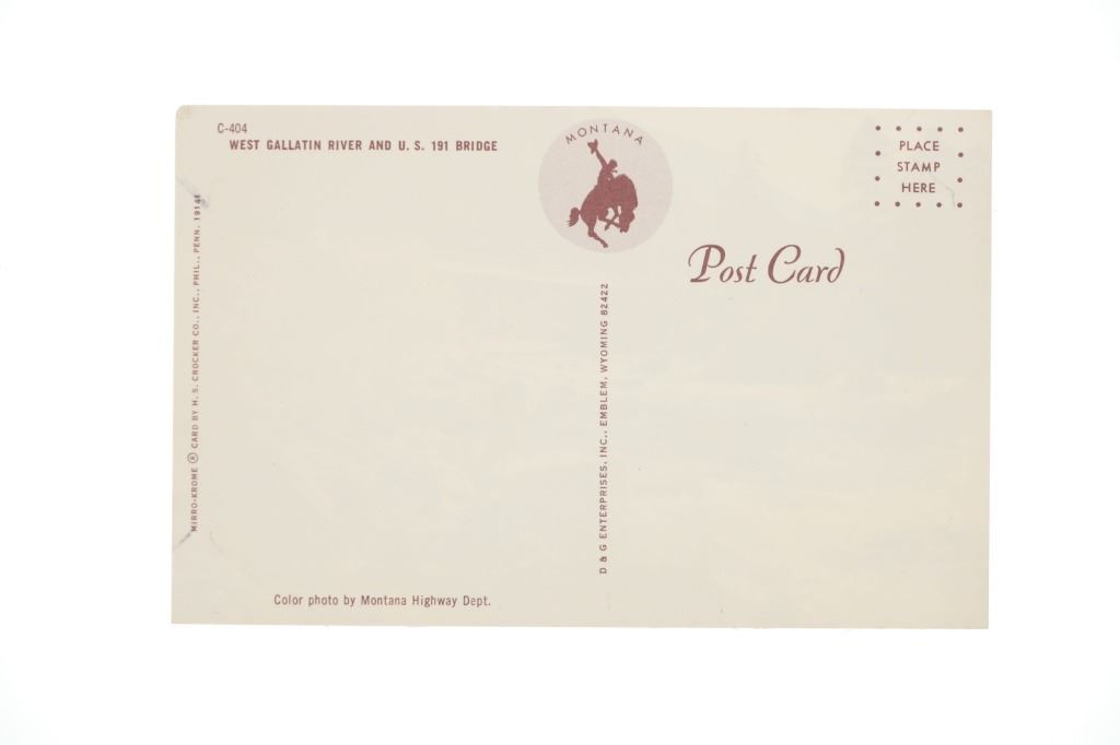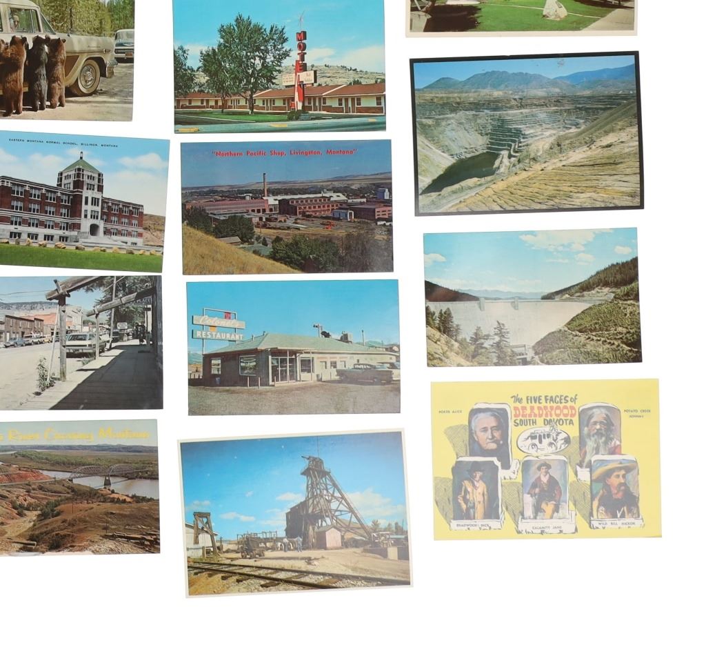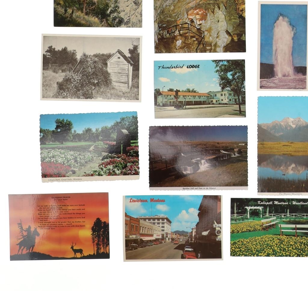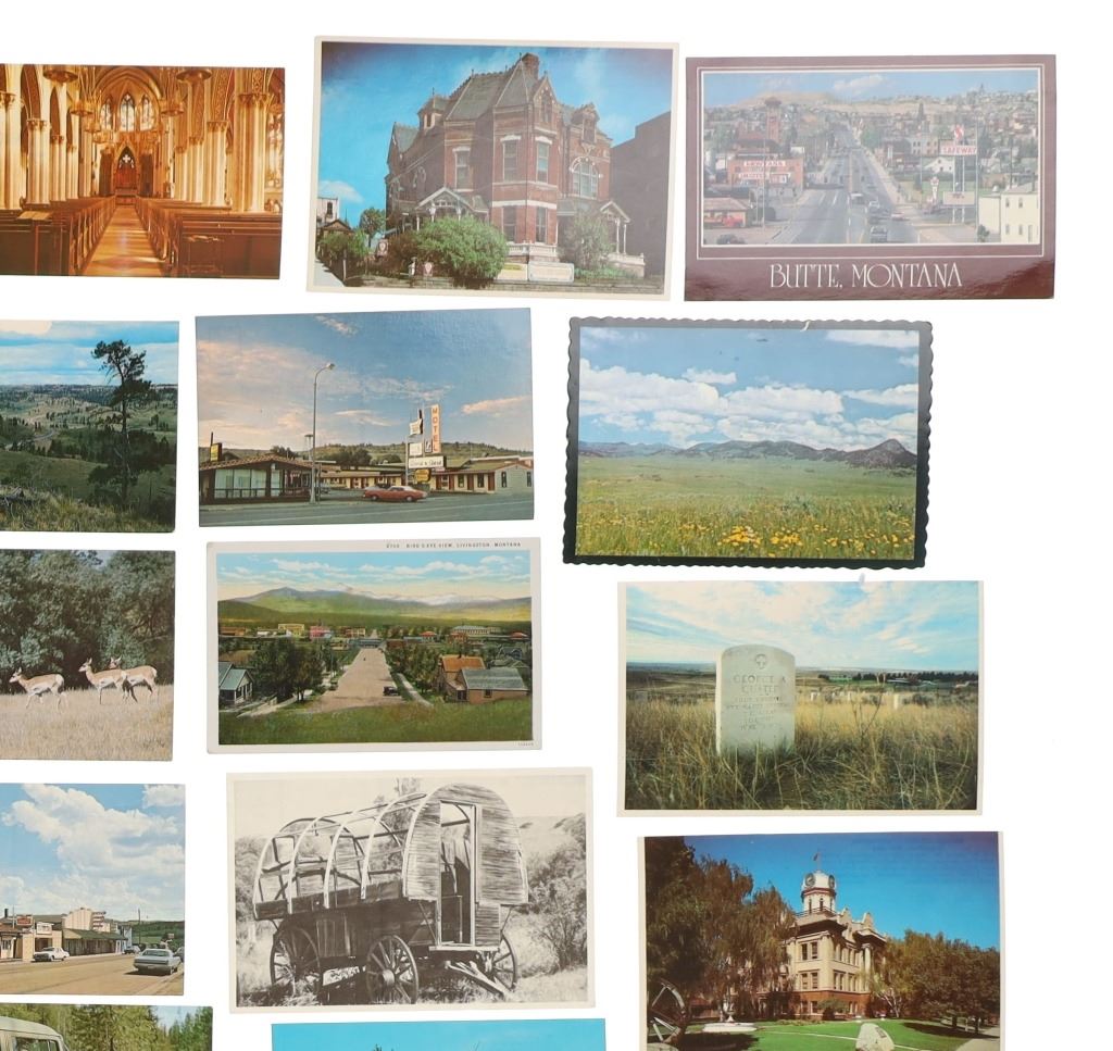Featured in this lot are seventy-three post cards and real photo post cards from various locations around Montana circa Early / Mid 20th Century. This lot contains nine real photo post cards and sixty-four post cards from various locations such as Missoula, Glacier National Park, Helena, Hungry Horse Dam, Gallatin River, West Gallatin River, Lewis & Clark Caverns, The Lady of the Rockies, Hell Roaring Gulch, The Berkeley Pit, Lewistown, Custer Battlefield, The Bear Paw Mountains, Butte, Billings, Fort Peck, Virginia City, Kalispell, The Mission Mountains, Livingston, Bozeman, Yellowstone National Park, Crater Lake, Beartooth Butte, The Hysham Hills, Wibaux, Missouri River, Bannack and Great Falls. The post cards show good condition overall with slight wear present from their age and handling over the years, but no major signs of damage are noted. They measure from 4 1/4" L x 6" W to 3 3/8" L x 5 3/8" W. They have a collective weight of 8 ounces.
