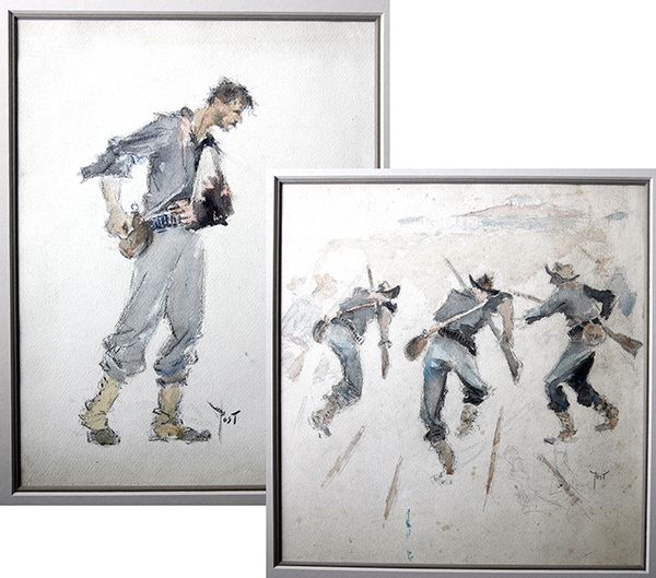 Post, Charles Johnson. (Wounded Soldier and Three Soldiers - Unfinished Sketch). Two watercolors: One of a wounded soldier, 11¾ x 9 in., signed at lower center, matted and framed to an overall size of 19¾ x 17 in.; the second is of three soldiers going up a hill (San Juan Hill?), with unfinished background, 11 x 10½ in., signed at lower right, matted and framed to an overall size of 19 x 18½ in. Both are scenes from the Spanish American War. Accompanied by the July 7, 1958 issue of LIFE magazine which has an article on Post. p 52-61.