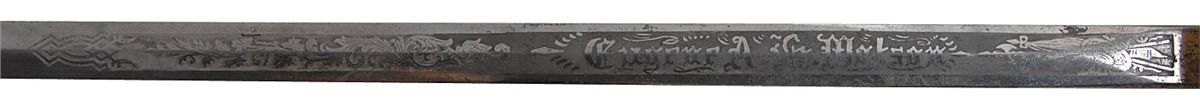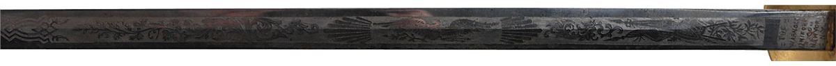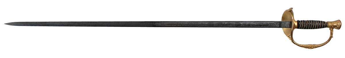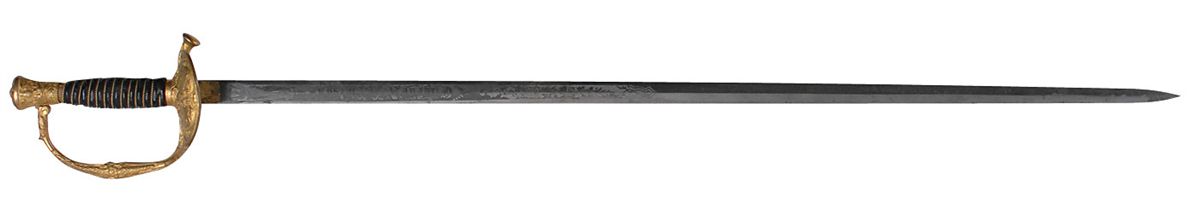 Post Civil War U. S. Army Model 1860 Staff and Field Officer’s Sword identified to Eugene A. K. Watson. The 29.75? straight double-edged blade is etched on the reverse ricasso with the name of the retailer “The/Warnock/Uniform/Co./New York/N. Y.” The blade is etched on both sides with floral scrolls and martial panoplies, the reverse with a spread winged eagle and the obverse with the owner’s name. The blade is clean with several dark age spots and some fine pitting at the tip. The hilt has a fixed clamshell guard with a relief eagle over a stand of flags. The urn shaped pommel also has a relief eagle on the obverse. The grip is missing about 5% of the leather wrapping at the top and retains all of its wire binding, the brass guard and pommel retain most of the original gilding. The scabbard is missing.
