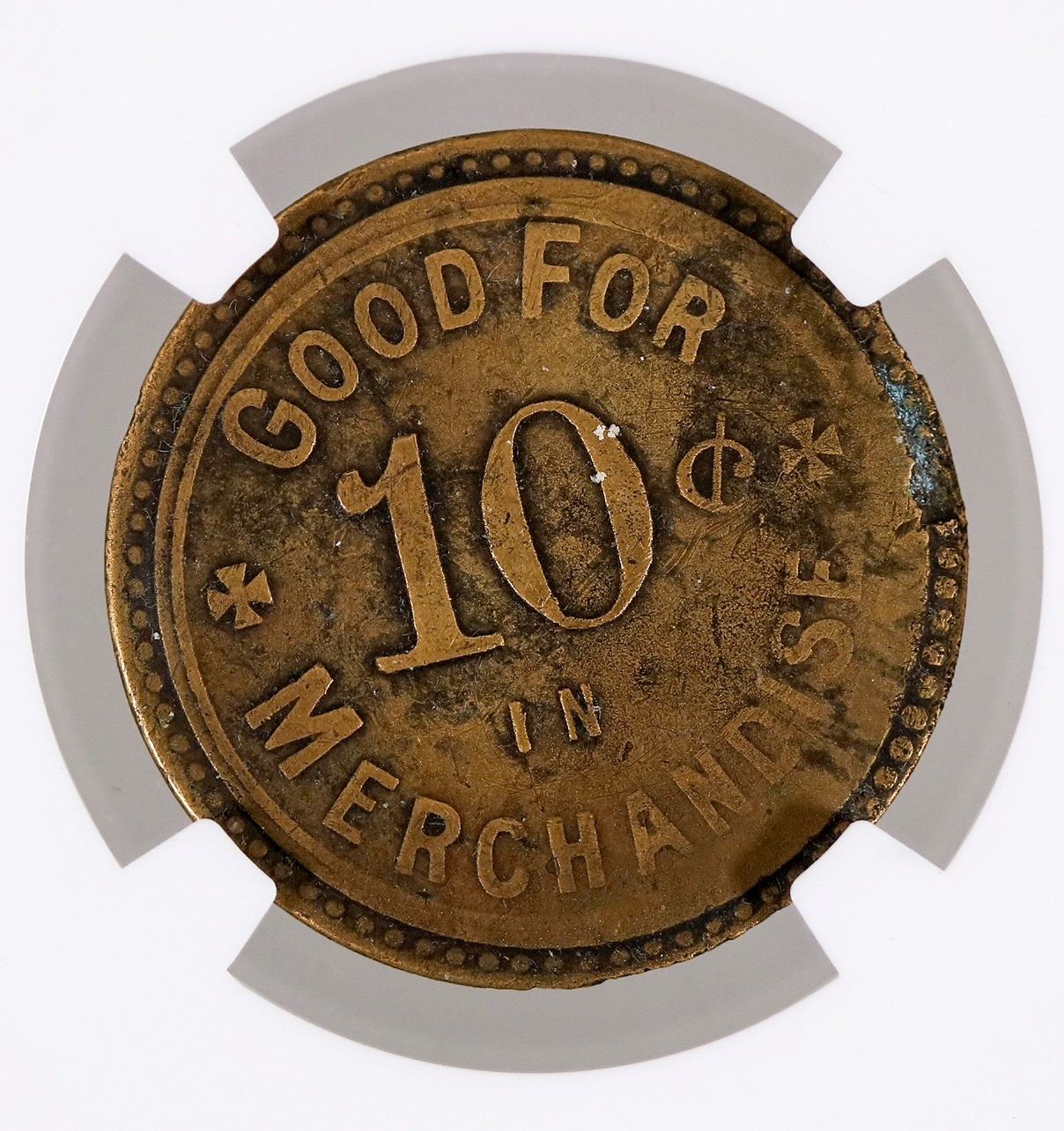 NGC certified VF Details. POST EXCHANGE / ALCATRAZ / ISLAND, CAL. / PATRICK & CO. S.F. // GOOD FOR / 10c / IN / MERCHANDISE; Br., rd., 25 mm.