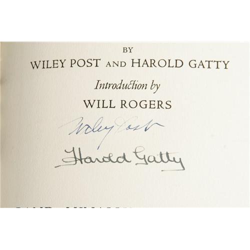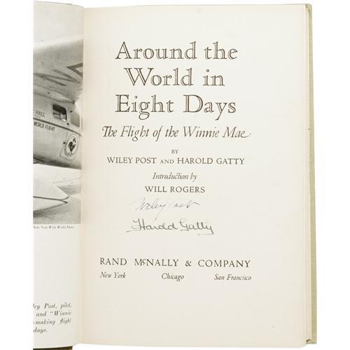 <B>Wiley Post and Harold Gatty Signed:<I> Around the World in 8 Days:</B></I> The Flight of the Winnie Mae.</B></I> (New York: Rand McNally & Company, 1931), first edition, 304 pages, facsimile of log book in back, signed by Post and Gatty on the title page, tan cloth with black titles, 8vo (6.25" x 8.75"), fine.<BR><BR><b>Shipping:</b> Books & Catalogs (<a target="_blank" href="http://www.heritageauctions.com/common/shipping.php">view shipping information</a>)