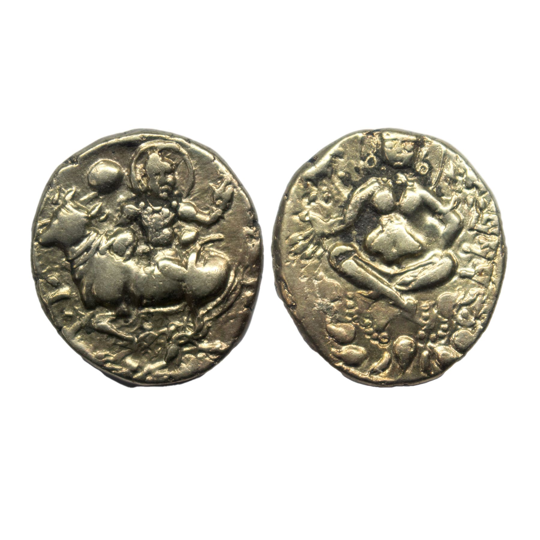 Post Gupta, Dynasties of Gauda, Mahasmanta Sasanka Deva (c. 606-619 AD), Base Gold Stater 8.70grms. OBV: King posed as lord Shiva reclining on his vehicle Nandi bull, Full Moon behind, legend ?Jaya? in Brahmi below, REV: Abhisheka Lakshmi nimbate, seated cross-legged on a lotus, holding lotus in one hand and making a gesture of benevolence with the other, while two elephants standing on lotuses lustrate her, with Brahmi legend ?Shri Shashanka? to right. (Sanjeev Kumar # Class I type). Very fine