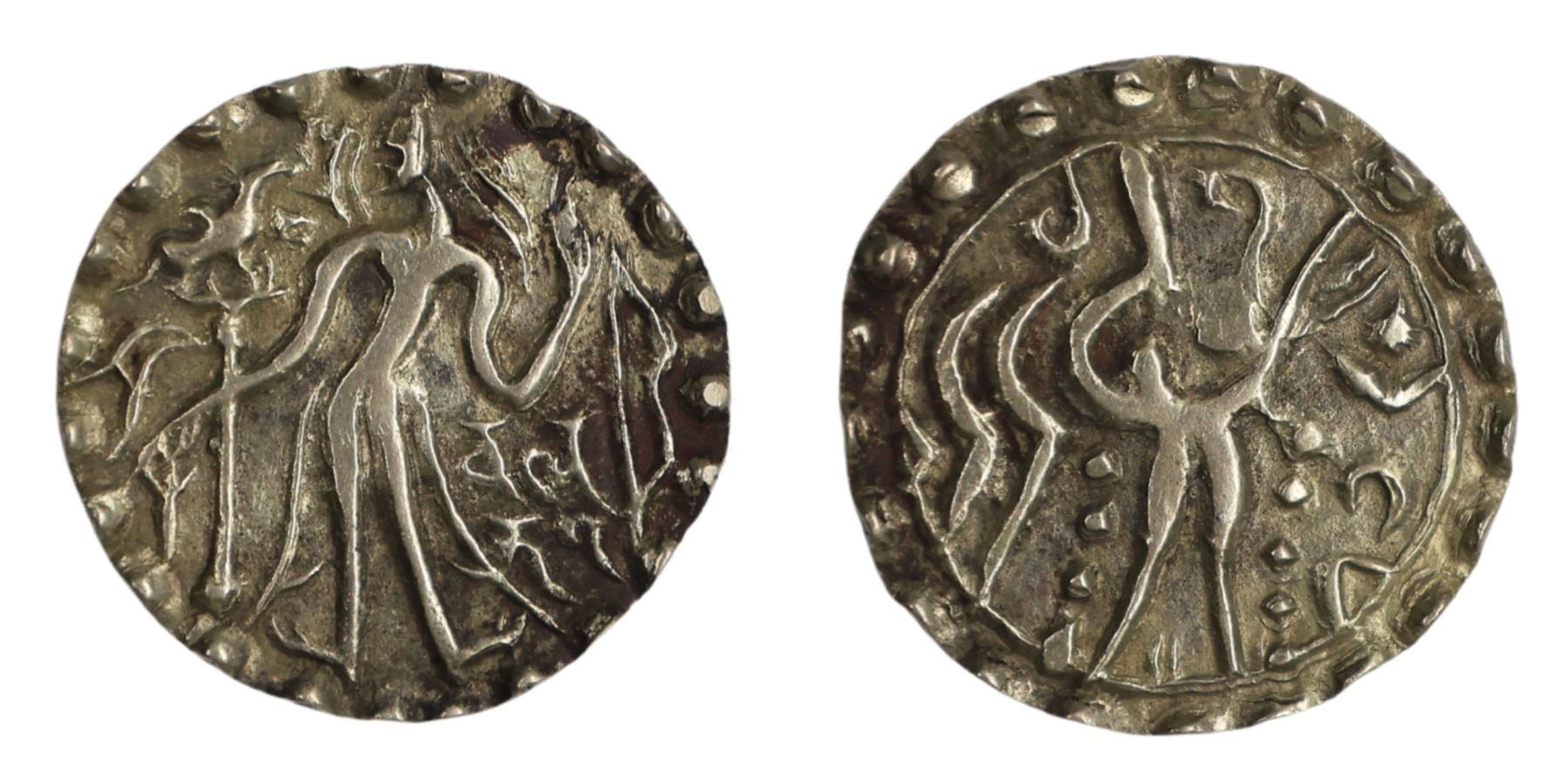 Post Gupta, Eastern Bengal Samatata Region, Debase Gold Dinar, 5.67g, 22.6mm, Obv: King standing to left, holding a bow in his left hand and an arrow in his right hand and arrow in hands, standard with a conch shell, ‘Shri' on top left, beneath the left hand ‘Balabhata', Rev: Goddess standing to right, degraded in artistic quality. (Bose & amp; Noman # SAM .17.2). Very Fine, Very Rare.This is a extreme rare variety debased larger flan gold coin of Balabhata, appears to be whitish.This ruler is recorded in a copper plate as being the son of Rajabhata of Khadga dynasty.