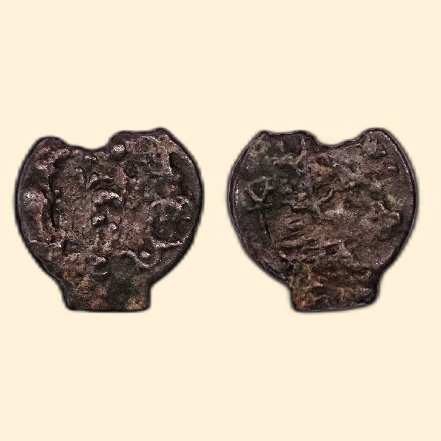 Post-Mauryan, Kaushambi Region (c. 250 BC). Gaj-Lakshmi type, Cast Copper, 8.73gms, OBV; Abhisheka Lakshmi standing on lotus in centre both side elephant showering water on Lakshmi, REV: Tree-in-railing in centre, indradhvaja on left side with taurine, ujjaini symbol and hollo cross on right side. (Pieper # 1114). Fie+.