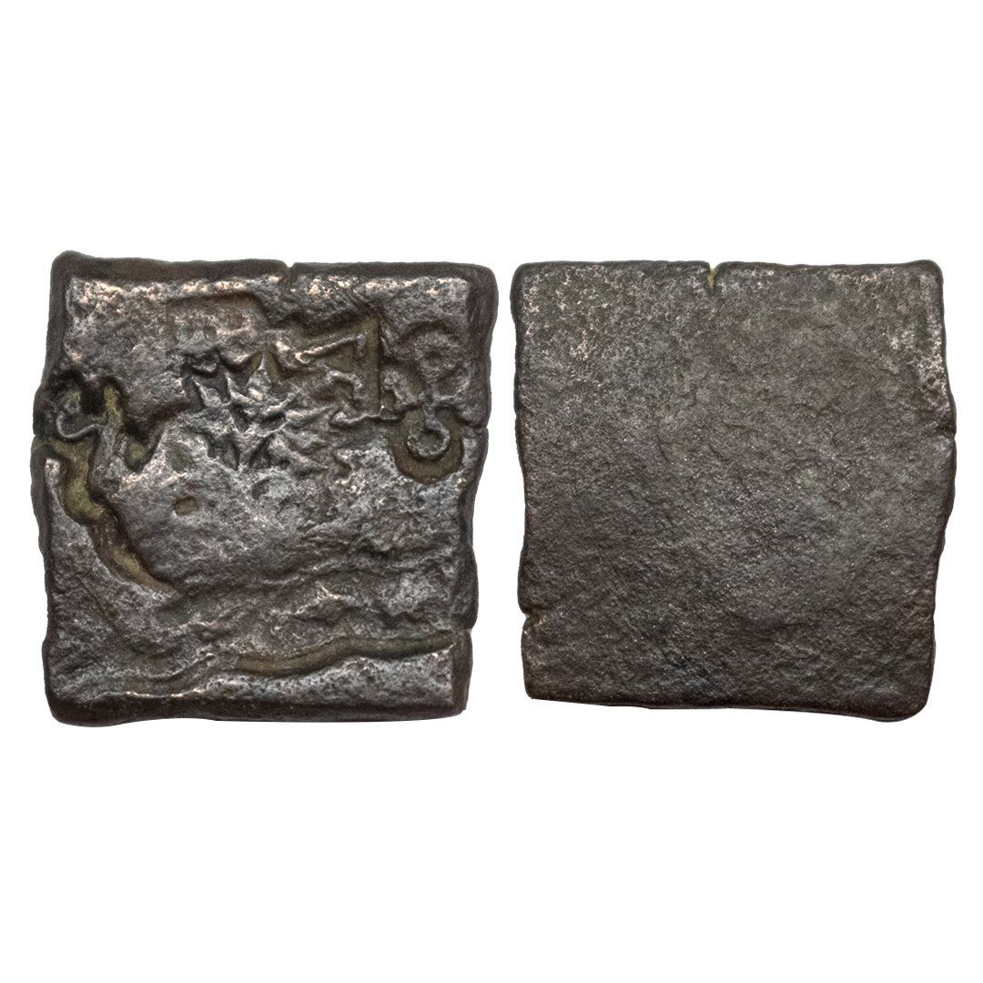 Post-Mauryan, Punch Marked, Vidisha Region, Copper Karshapana, 3.32Grms, OBV: Elephant, tree-in-railing, river with fishes and ujjaini symbol, Uniface. (Pieper # 876 type). Fine.