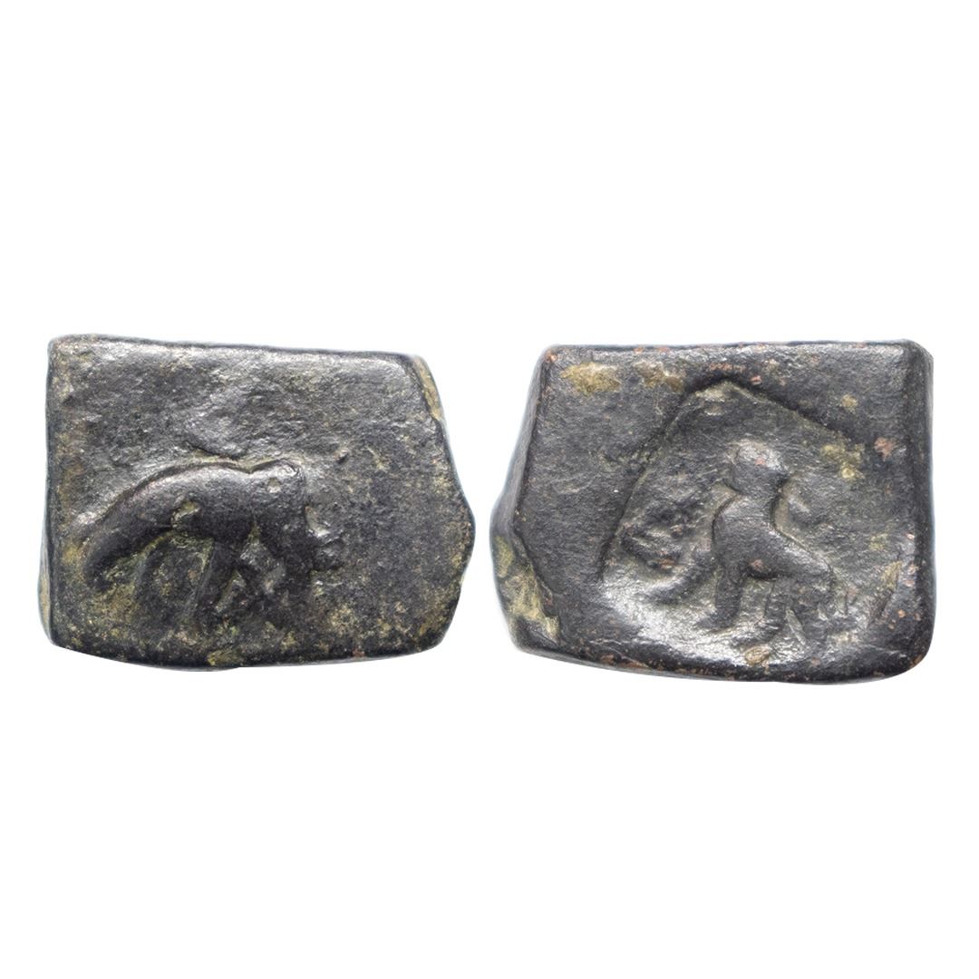 Post-Mauryan, Taxila Region, Punch Mark type, Copper Unit, 11.67Grms, OBV: Lion waling to left above svastika and front of three arched hill with crescent symbol, REV: Elephant walking to right above three arched hill with crescent symbol. (Pieper # 1494). Very Fine+.