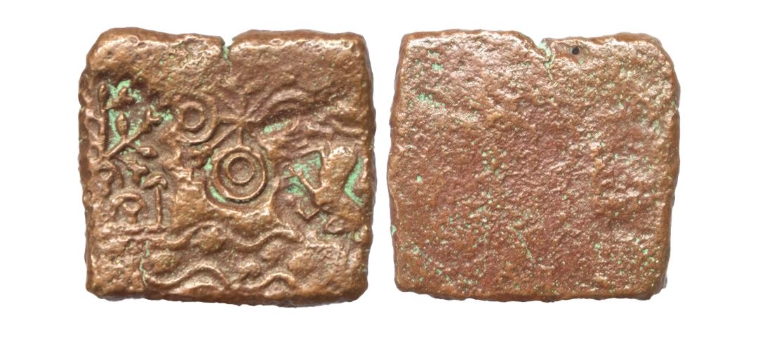 Post-Mauryan, Vidisha region, Punch Marked, Narmada valley, Copper Unit, OBV: Double orb ujjaini, tree-in-railing, river with fishes and horse symbol, Uniface. (Pieper # 882). Very Fine.