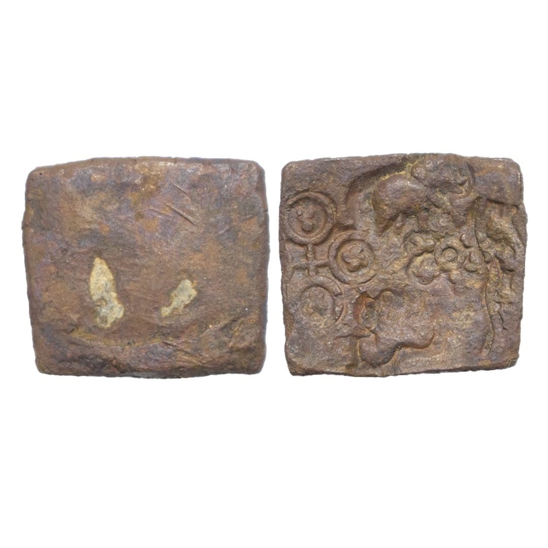 Post-Mauryan, Vidisha region, Punch Marked, Uninscribed, Copper Unit, 8.10Grms, Five symbol type, OBV: Elephant, horse, six armed, four orb ujjaini symbol swastika in each orb and river symbol with fishes, Uniface. (Pieper # 877).