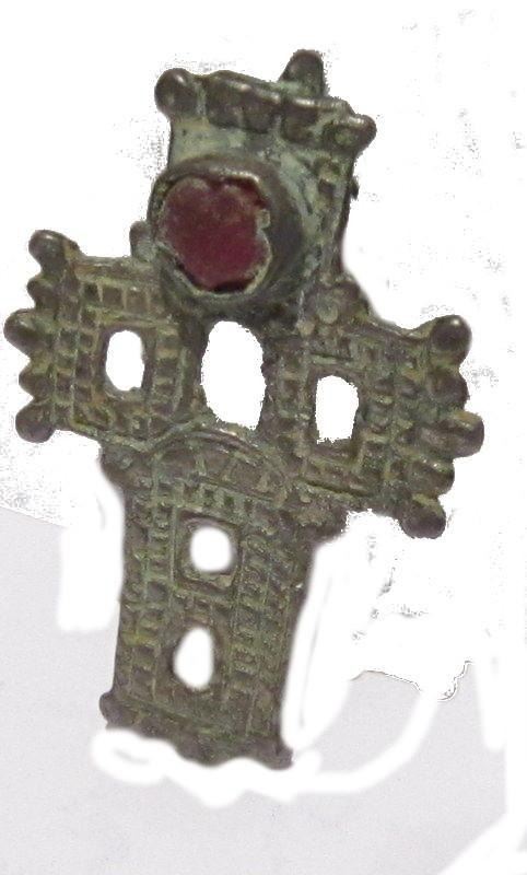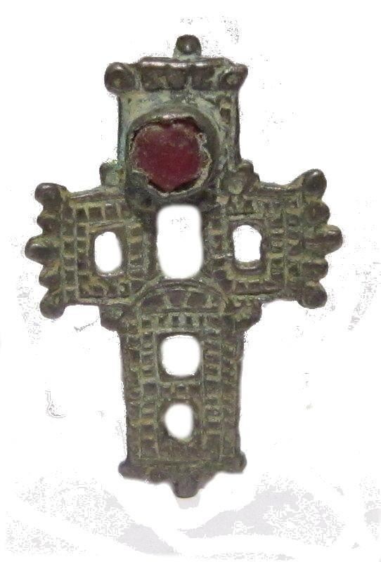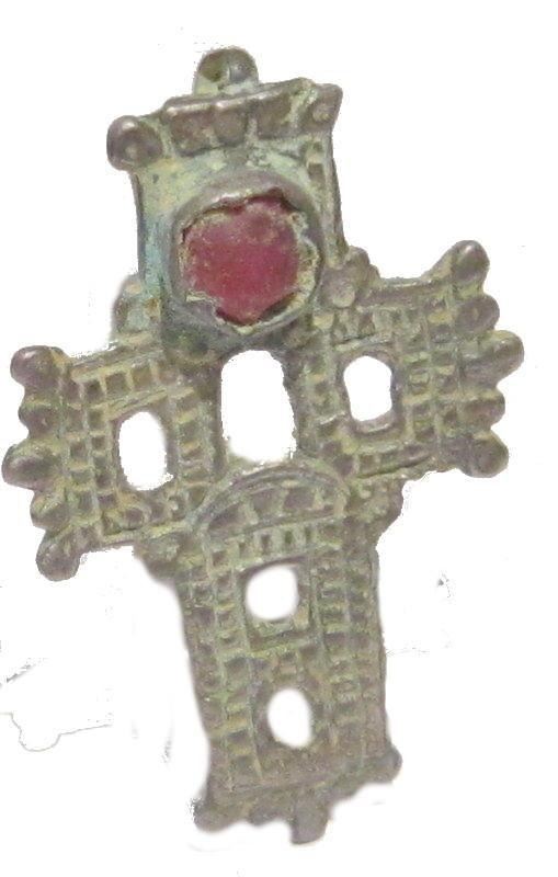 This Silver(low silver) Post Medieval Cross with engraving on all sides and with red stone. This depiction is stylized with exaggerated features and is an exemplary example of late medieval craftsmanship.The items other half has been lost to antiquity. The cross is well clean. circa 12th.-17th. Century A.D., Relic is about 2.15" in length (55 mm) Weight:10.31gr. - 9319-021918-EB-83535