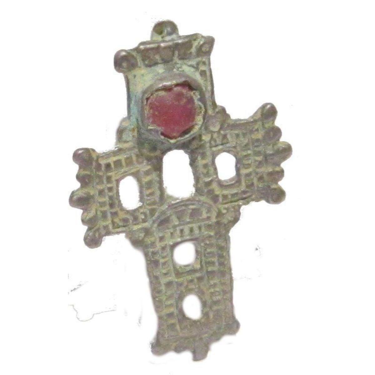 This Silver(low silver) Post Medieval Cross with engraving on all sides and with red stone. This depiction is stylized with exaggerated features and is an exemplary example of late medieval craftsmanship.The items other half has been lost to antiquity. The cross is well clean. circa 12th.-17th. Century A.D., Relic is about 2.15" in length (55 mm) Weight:10.31gr. - 9319-021918-EB-83535