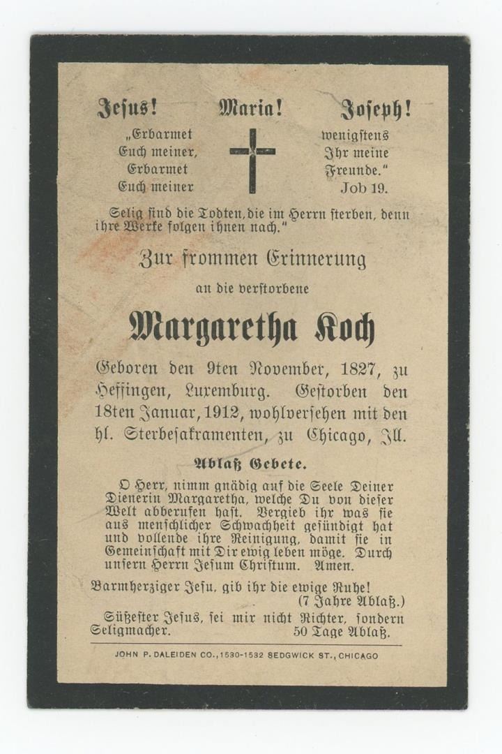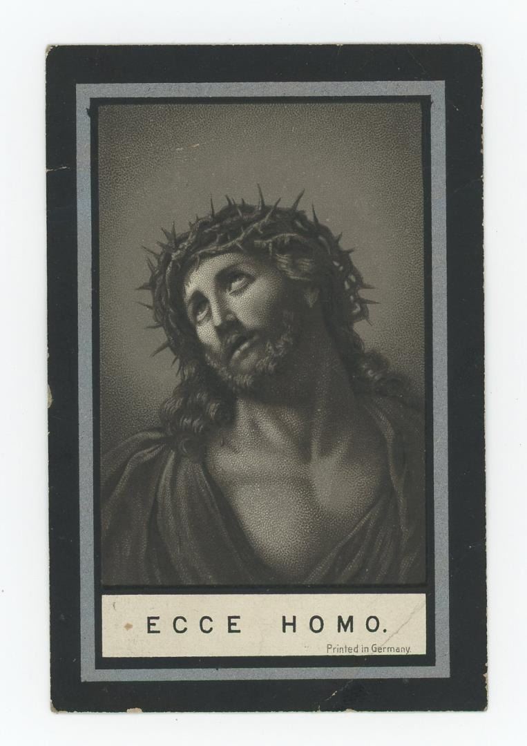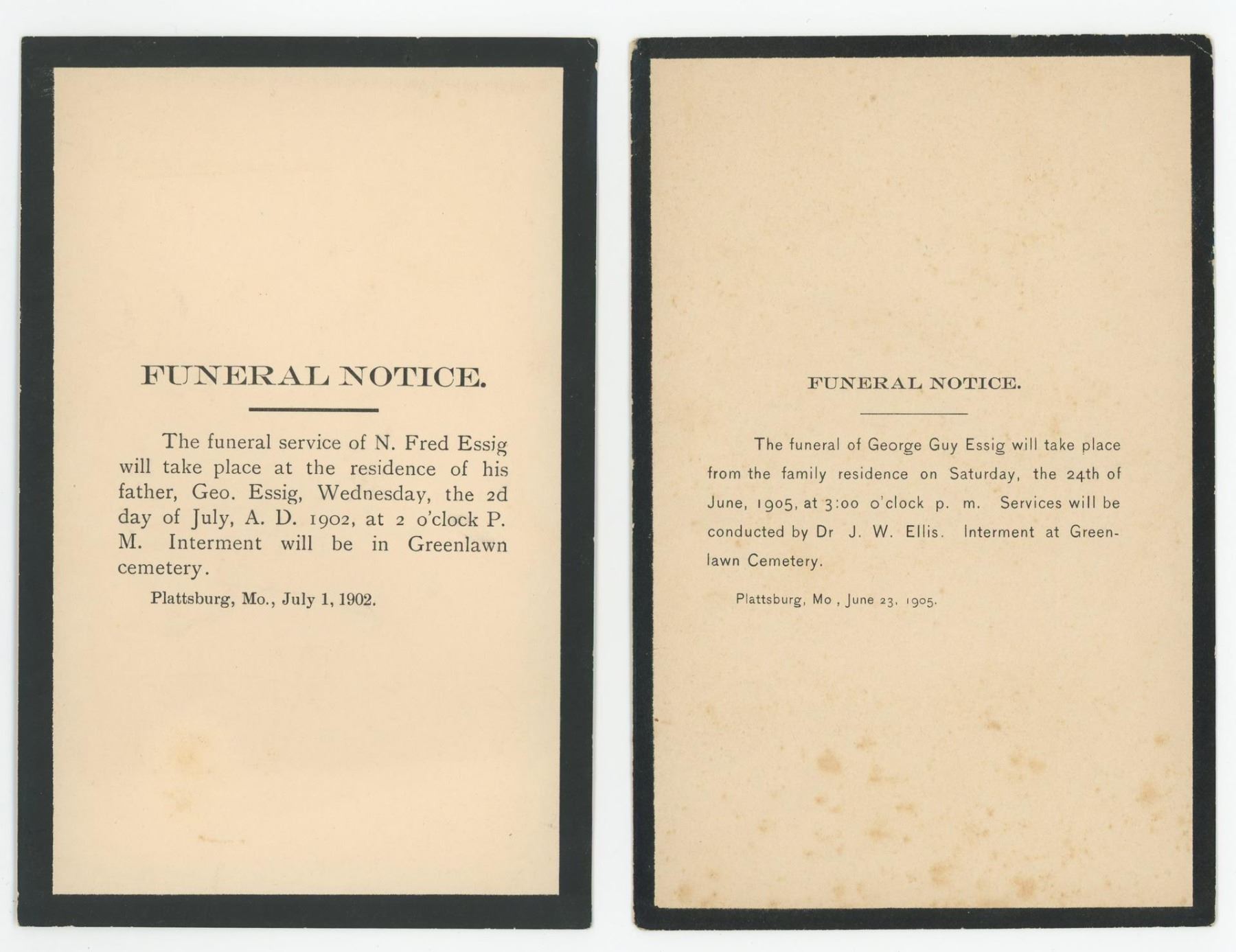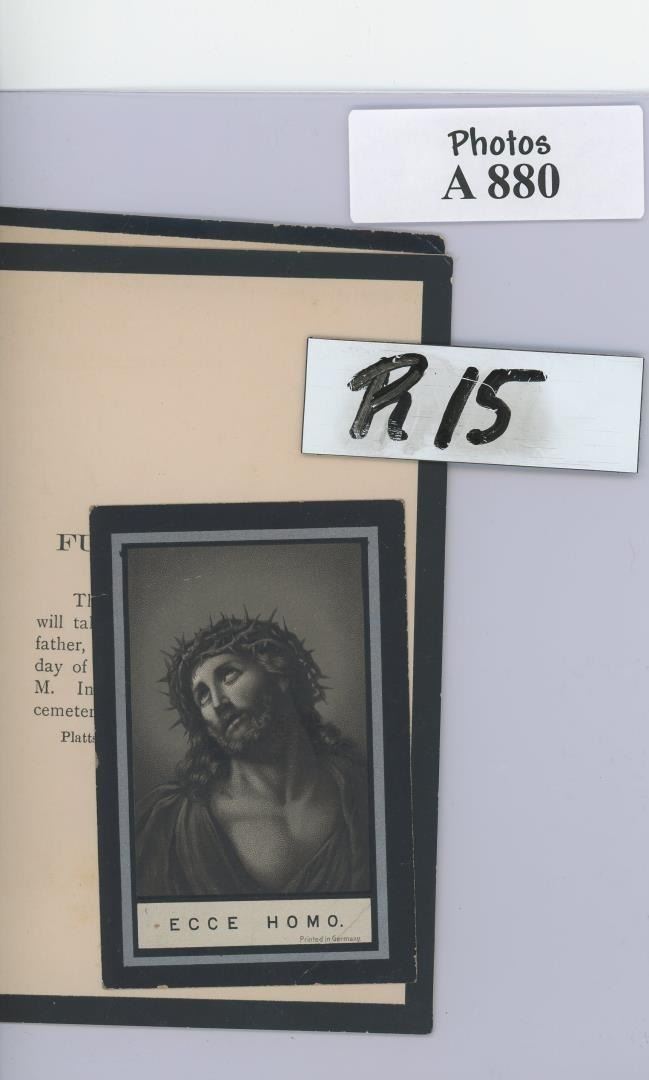 Two notices are from men in the Essig Family in Plattsburg, Missouri. The other is in German and features an image of Jesus and a prayer.