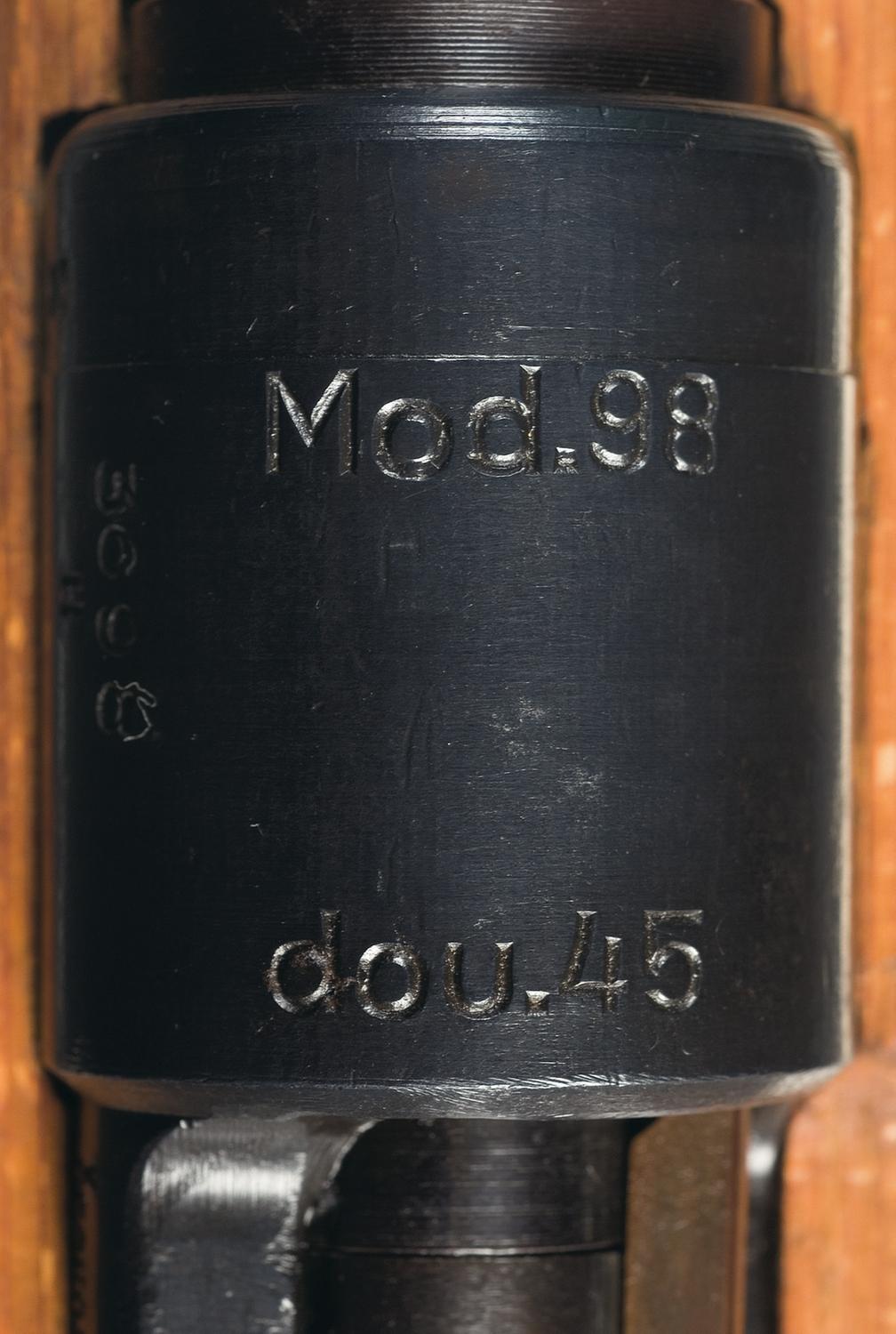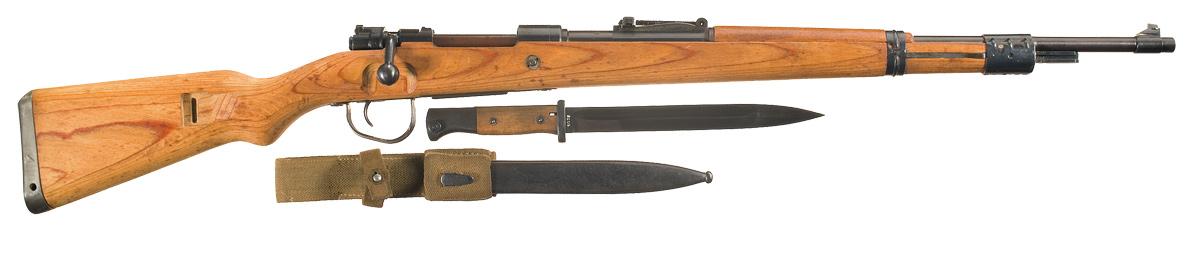 Blade and tangent sights, with "standing lion" proofs on the barrel and receiver ring, "BRNO" address on the sidewall, and "Mod.98/ dou.45" on top of the ring. Stamped components, with later-style barrel bands, enlarged trigger guard and matching bolt. Smooth stock, with "P" penciled into the sling cutout and a cupped buttplate. With a "44agv" (Berg, Solingen) bayonet with 9 3/4" blade, smooth wood grips, metal sheath and canvas frog. Appears unissued.
