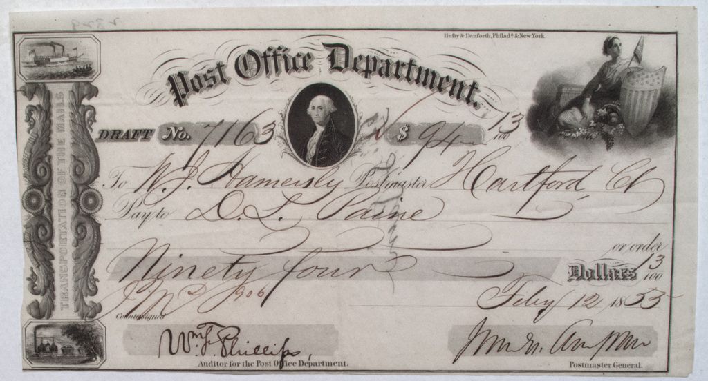 To WJ Hamersly to pay DL Paine $94.13. Four small vignettes: George Washington, Lady Liberty, steamship, and railroad engine. Signed by postmaster general and auditor for the post office. Looks nice!City: HartfordCounty: State: CT