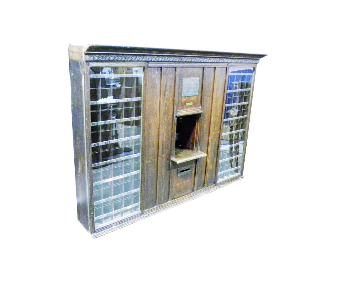 Post Office Counter and Boxes. The Postmaster's Supply Company, Baltimore, MD. Oak, Very good original condition. 70 X 49 X 11 inches.