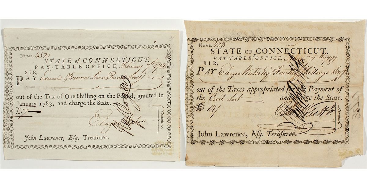 c1793 Lot of 2: very early paper bills, with a 14 Shilling note and a 7 Pound note. They read "State of Connecticut. Pay-Table Office." These unique bills are both litho-printed, and hand lettered for serial numbers, dates, and recipient. They are signed by an official that is not legible, and has a "John Lawrence, Efg. Trefurer" printed at the bottom. Each has an intricate border band printed around its perimeter. These measure approx. 6"x4.5" each. Both are in good to very good condition, with some edge wear evident. Lynn Langdon Collection - HKA#65646