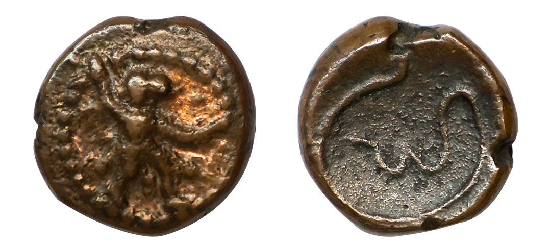 Post Vijayanagar, Local Polygars, (17-18c AD), Copper Kasu, 2.80 gms, Obv. Standing deity Hanuman, facing right, in Veera pose, Dotted border around, Rev. Letter ‘Shri’, Unlisted type, very fine, very scarce.