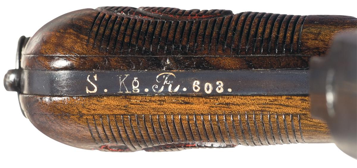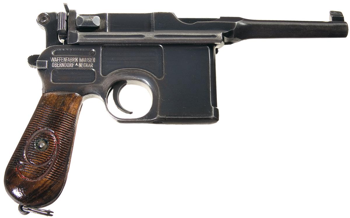 This is an example of a WWI, 1896 Broomhandle Mauser "Red 9" military pistol that was reworked circa 1920 during the Weimar period for the police. The right side of the pistol receiver is marked: "WAFFENFABRIK MAUSER / OBERNDORF A NECKAR." and the top of the barrel chamber is marked: "WAFFENFABRIK / MAUSER / OBERNDORF A/N." There is a Crown "U" proof mark located on the upper left side of the receiver on the flat below the serial number and directly behind that is a larger "1920" rework date stamp. The adjustable rear sight has been completely milled off and it is fitted with just a fixed blade on the rear of the base. The walnut grips have the large "9" burned into both sides that have been filled with red paint. The pistol has the standard arsenal rework rust blue finish on all the parts.