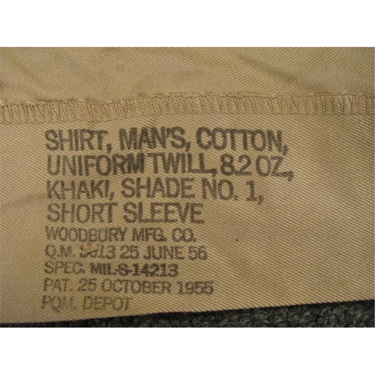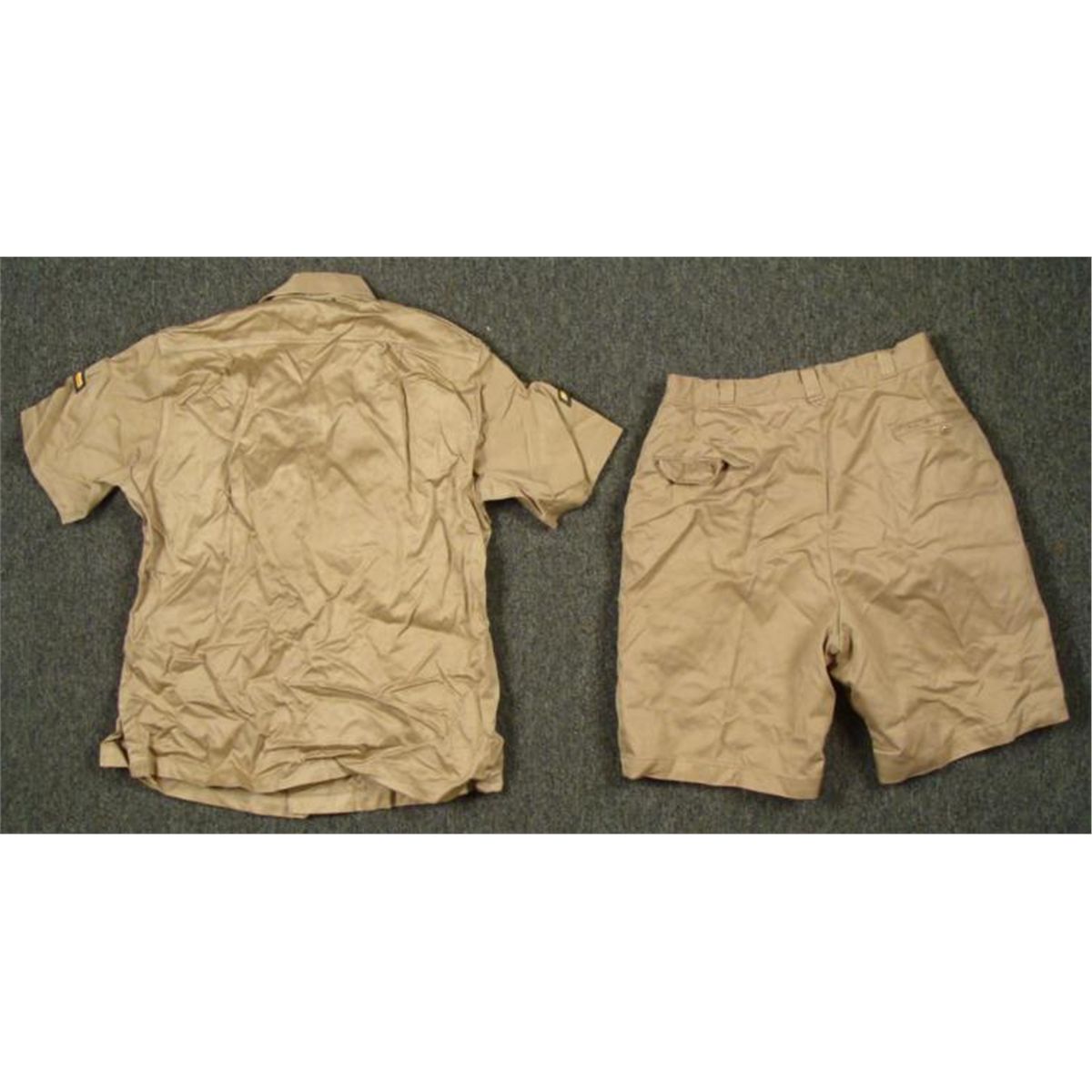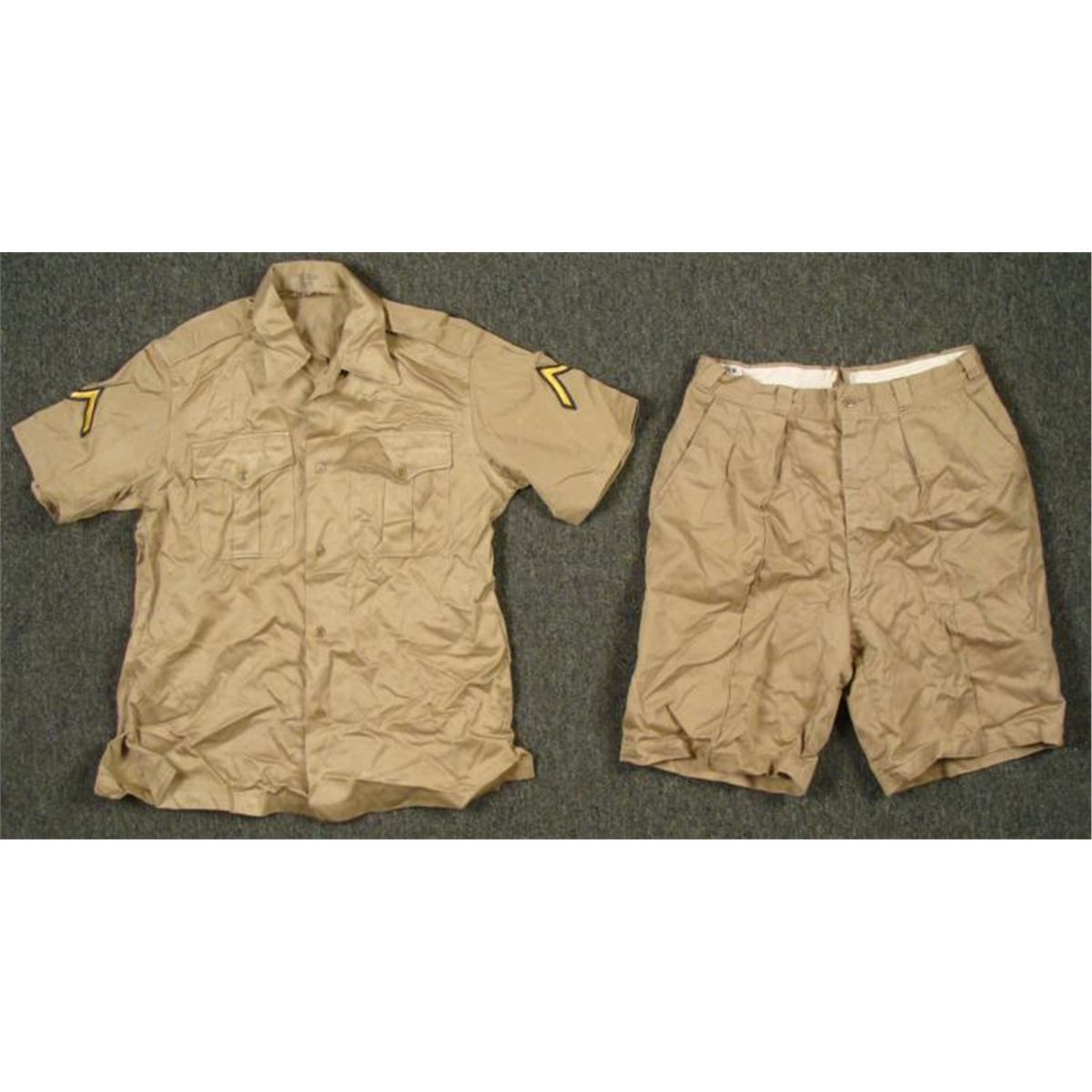Post WWII U.S. MILITARY TROPICAL UNIFORM-SHORT SLEEVE SHIRT (PRV CHEVRON) & SHORTS-MEDIUM-TAN KHAKI * BOTH PCS MARKED W.GI'S ID #'S-SHIRT MARKED MEDIUM *