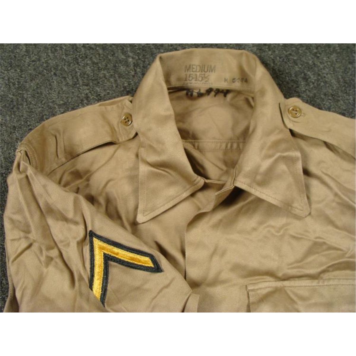 Post WWII U.S. MILITARY TROPICAL UNIFORM-SHORT SLEEVE SHIRT (PRV CHEVRON) & SHORTS-MEDIUM-TAN KHAKI * BOTH PCS MARKED W.GI'S ID #'S-SHIRT MARKED MEDIUM *