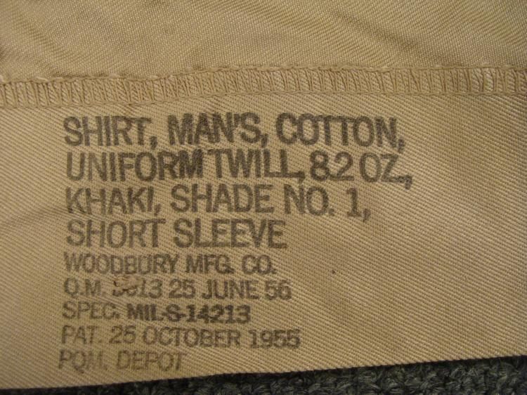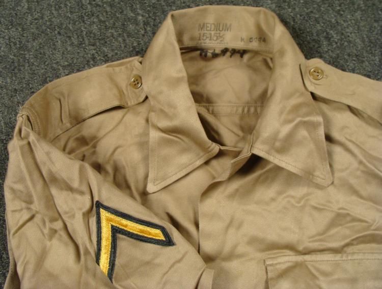 Post WWII U.S. MILITARY TROPICAL UNIFORM-SHORT SLEEVE SHIRT (PRV CHEVRON) & SHORTS-MEDIUM-TAN KHAKI * BOTH PCS MARKED W.GI'S ID #'S-SHIRT MARKED MEDIUM *