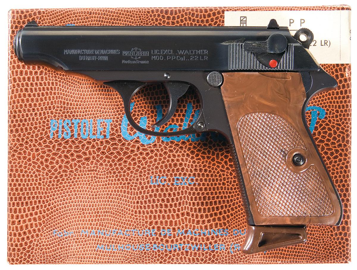 Fixed sights on a slide marked with maker/model/caliber markings on the left side and "Repr. J.V. ASTROM-BJURTJARN" on the right. Fitted with checkered grips. Complete with factory pebble box numbered to the gun, two magazines with plastic extension, cleaning rod, papers, and a checkered thumb rest left grip panel. Consecutively serial numbered to another Manurin Walther Model PP pistol that is in this auction.