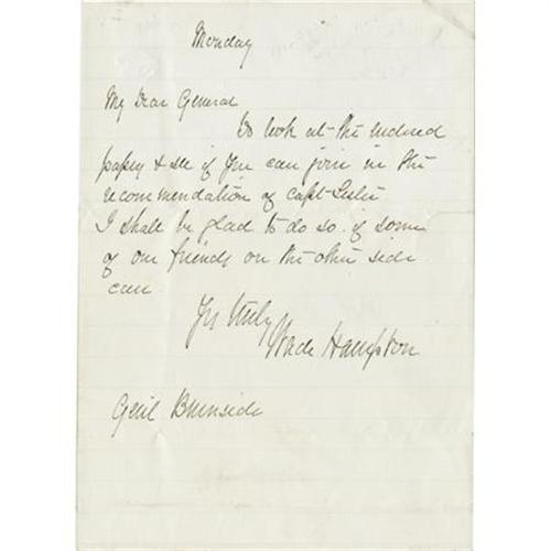 <B>Post-War Wade Hampton Autograph Letter Signed,</B></I> one page 5” x 7”, likely Washington, D.C., n.d., ca. 1880, addressed “<I>Gen'l Burnside U.S.S.</B></I>” on verso panel. The letter reads, “<I>Go look at the enclosed papers & see if you can join in the recommendation of Capt Leslie. I shall be glad to do so if some of our friends on the other side can.</B></I>” Small marginal split, one corner crease, else fine condition. <BR>Although the identity of “Capt. Leslie” remains a mystery, this letter is obviously a note from one U.S. senator to another. Former adversaries Wade Hampton of South Carolina and Ambrose Burnside of Rhode Island held concurrent seats in the U.S. Senate between 1879 and 1881. <BR><BR><b>Shipping:</b> Flat Material, Small (<a target="_blank" href="http://www.heritageauctions.com/common/shipping.php">view shipping information</a>)