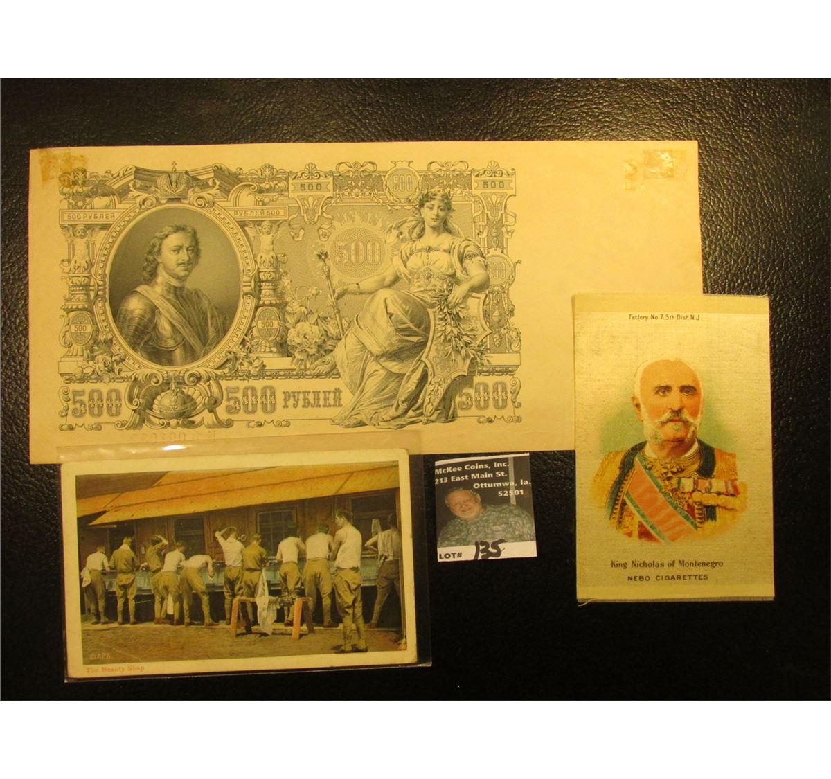 Post card depicting Soldiers performing Clean Up titled "The Beauty Shop"; "Factory No. 7. 5th Dist. N.J. King Nicholas of Montenegro Nebo Cigarettes" Silkie; & a large 1912 Russia 500 Rouble Banknote, U.S.S.R. Pick # 14, Peter I left, EF.
