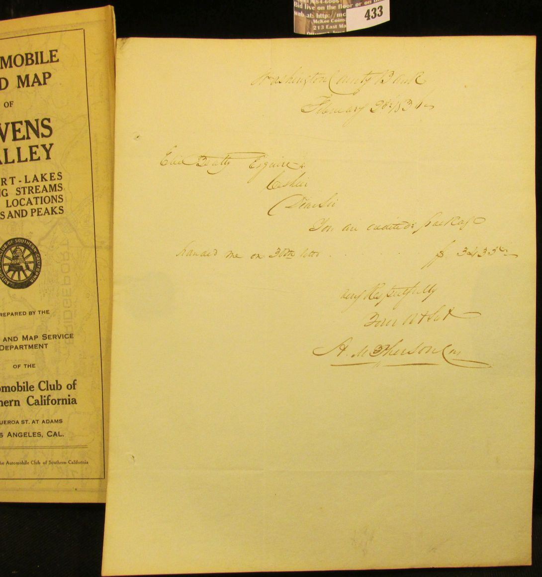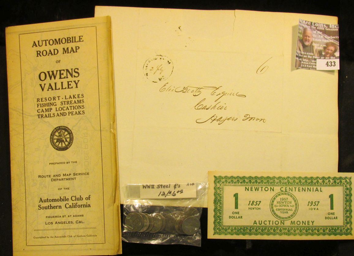 Post-marked Folded letter from "Washington County Bank Feb.28th, 1831"; "Automobile Road Map of Owens Valley Resort-Lakes Fishing Streams Camp Locations Trails and Peaks"; "Newton Centennial 1857 1957 Newton Iowa Auction Money"; & (12) World War II Steel Cents.