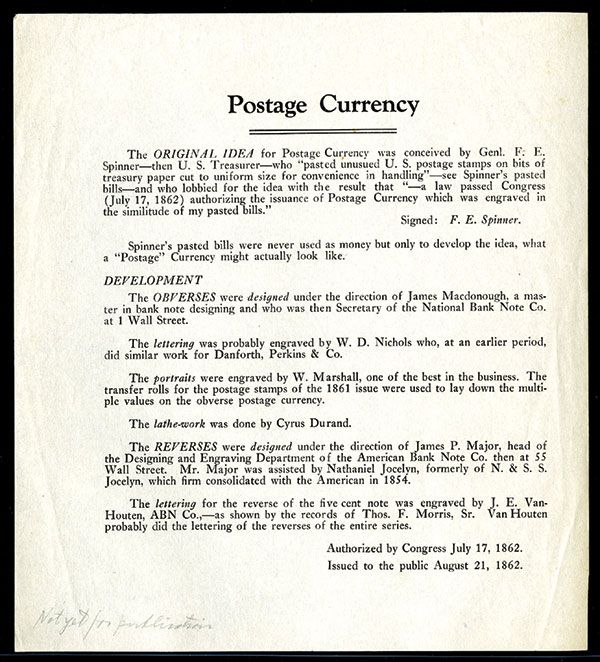 Detailed letter or draft of book page with information about Spinner's “Original Idea”, possibly officially done or privately, but is a very detailed history of the development of fractional Currency. (ex. Stack's “The 52 Collection, January 2011).