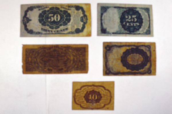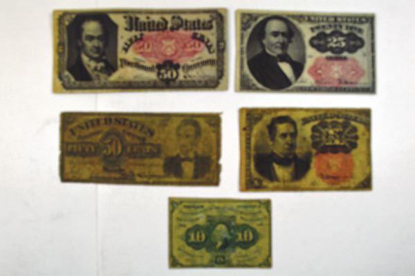 Fractional Currency. 10, 25, 50 Cents. Includes Fr. 1242, 1265, 1309, 1374, 1381. Lincoln 50 cent is Fair, others Very Good or a bit better. 5 pieces.