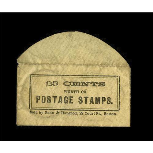 <B>Postage Stamp Envelope 25¢ Snow & Hapgood Boston Extremely Fine.</B></I> Listed in the Krause and Lemke book as KL130-25. This is an extremely rare Boston issuer. Almost all known postage stamp envelopes are from New York City. As a category, these envelopes are among the rarest of all Civil War era emergency money collectibles. The envelope is a bit soiled, but wholly intact with no tears or problems. Apparently, either a silver quarter or piece of encased postage was stored in this envelope for years as its imprint remains.<BR><BR><b>Shipping:</b> Coins & Currency (<a target="_blank" href="http://www.heritageauctions.com/common/shipping.php">view shipping information</a>)