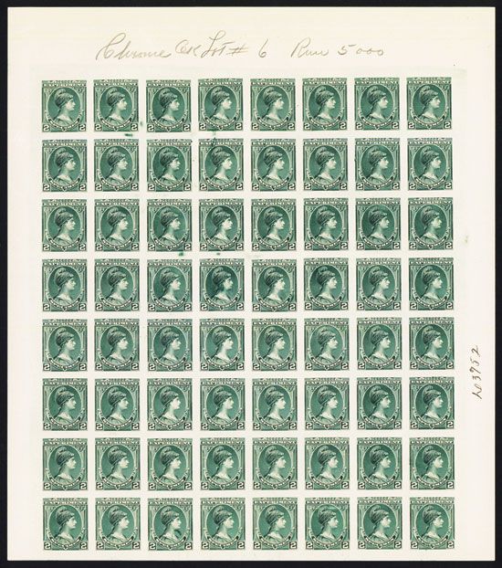 ND (ca.1890-1910), Sheet of 64 Ò2Ó denomination stamps with ÒLibertyÓ vignette in green on gummed stamp paper, some penciled notations in the margins, AU to Uncirculated condition and rare. ABNC.
