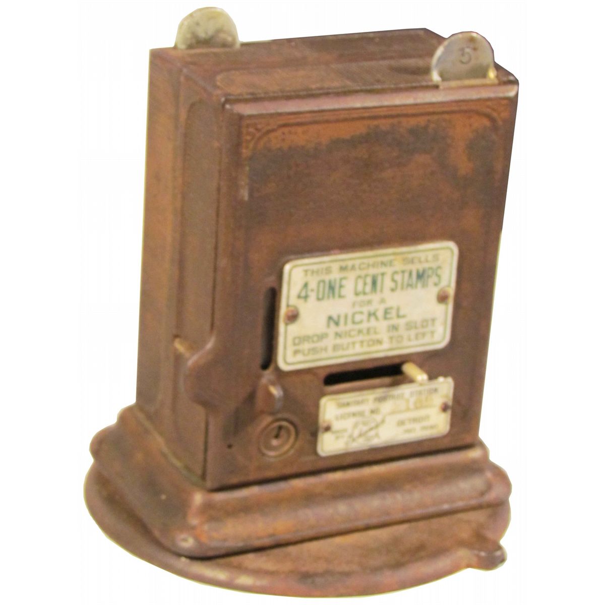 Postage Stamp Vendor by the Schermack Co. Detroit, MI. Sanitary Postage Station ca. 1930's. One side vends 4 one cent stamps for a nickel the other 3 three cent stamps for a dime. Good original condition, comes with key. 7 X 8 1/2 X 7 inches.