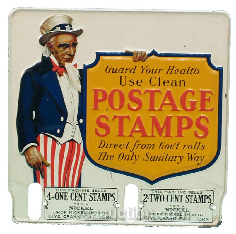Postage Stamps Vending Machine Embossed Tin Sign w/ Uncle Sam - 10" x 10"