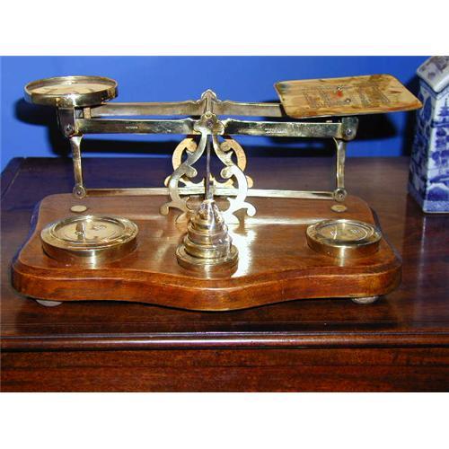 This is an eyecatching postage scale, complete wit it's original set of brass weights(8 in all) from 0.5 oz to 2 lbs. It is marked for letters and parcels. The left hand brass pan holds weights to balance the parcel or letter, which is placed on the right brass pan. This is inscribed with the approriate weights and corresponding cost of postage.