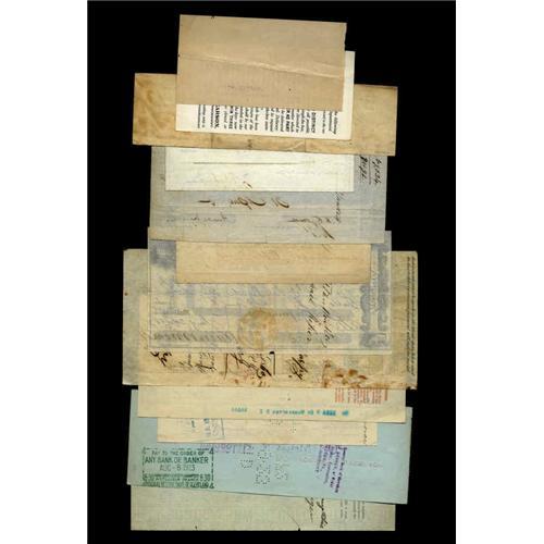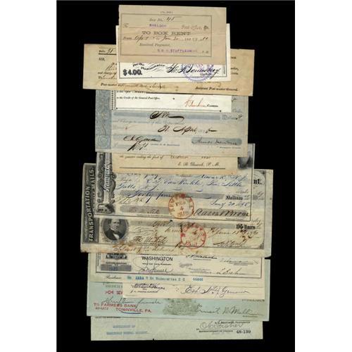 <B>Postal Checks.</B></I> These checks are related in one way or the other to the Post Office. They span the years from 1828 - 1933. It is noticed that the 1933 check is a Post Office check for 4¢, while the 1911 Post Office Settlement Warrant is for 3¢ and it was issued in lieu of an invalid money order. Two post office box rent receipts from 1886 and 1888 are also included in this lot. <I>There will be no returns of this lot for any reason.</B></I>