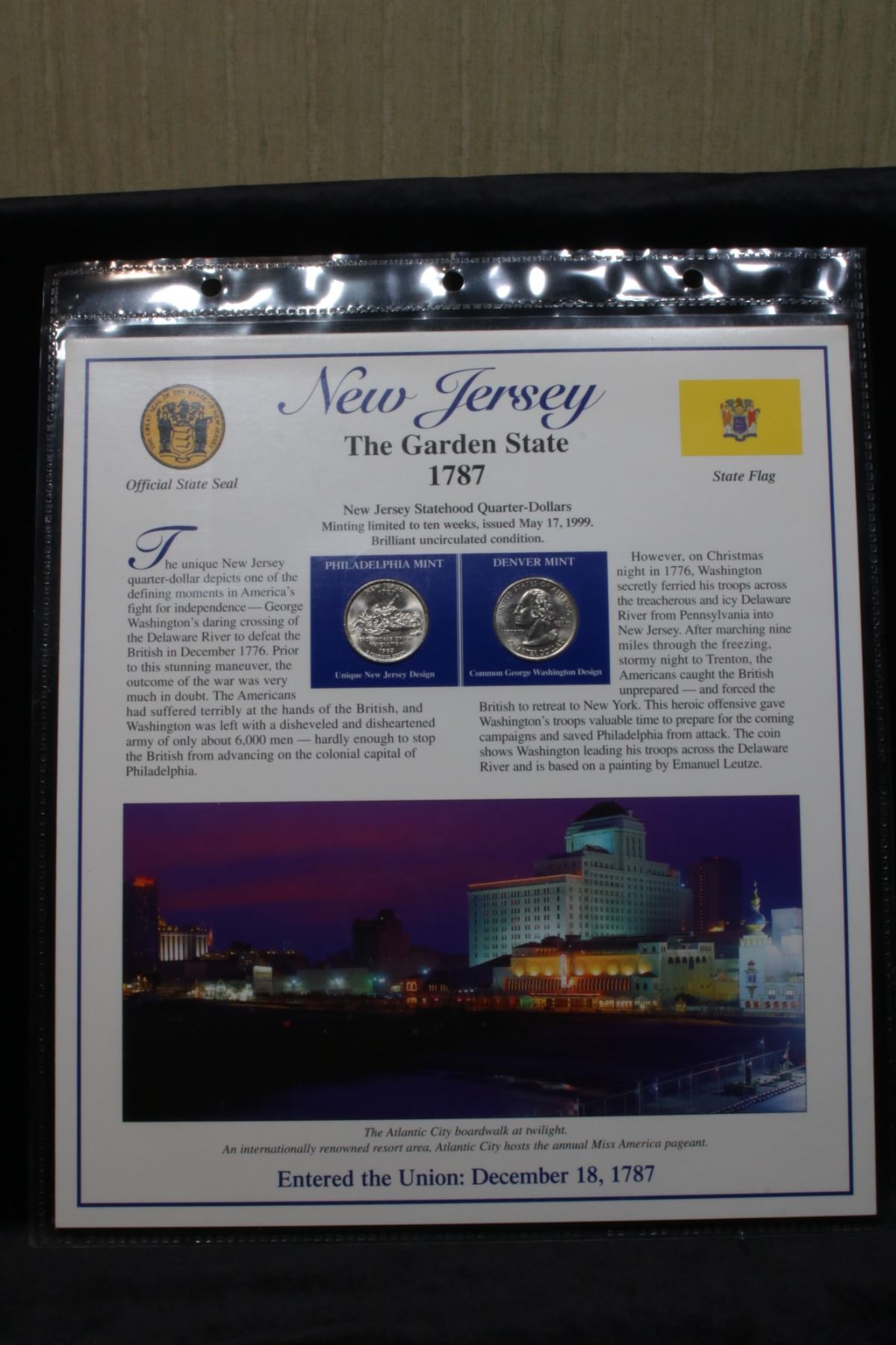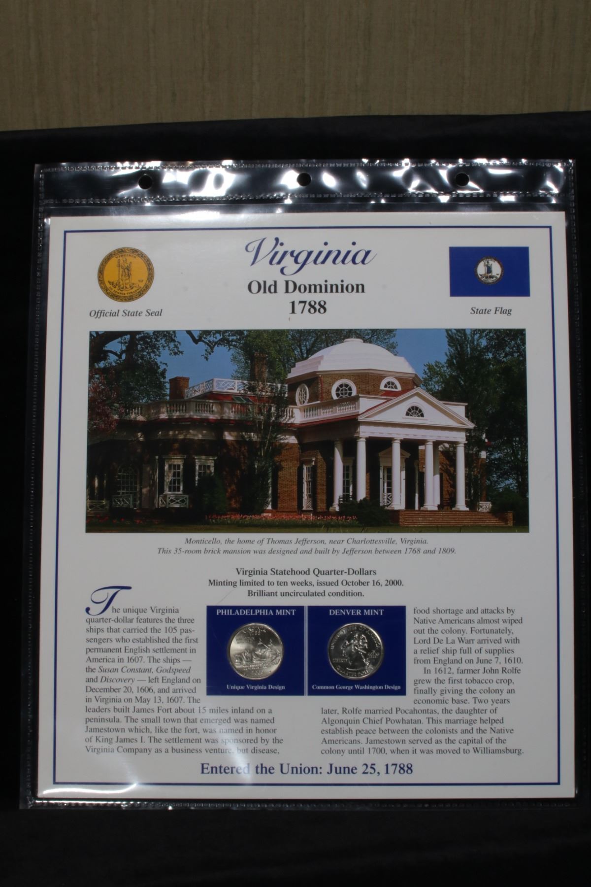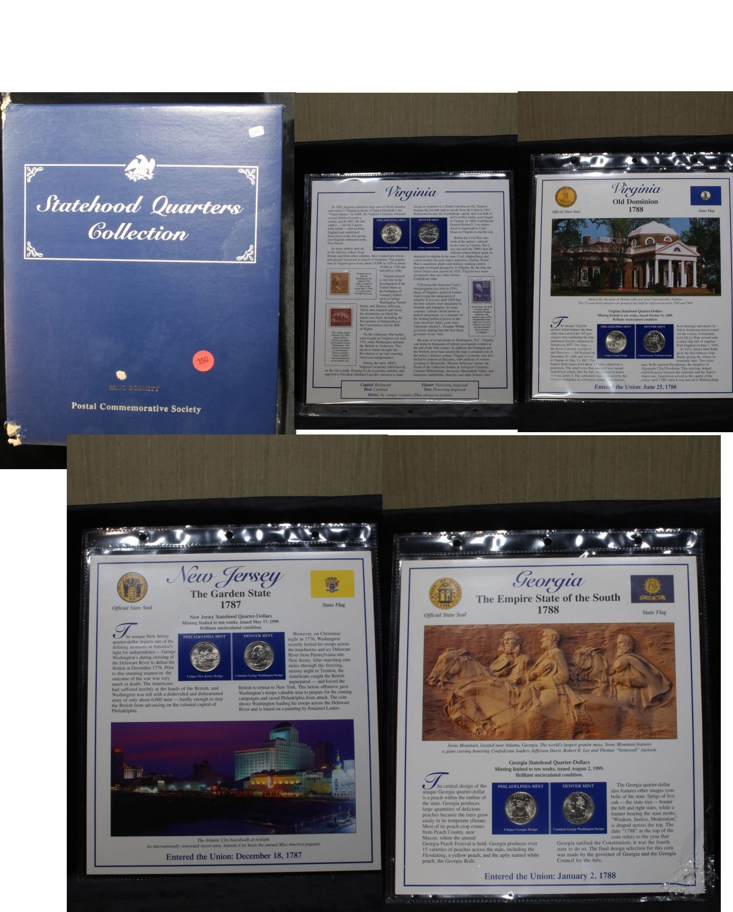 Postal Commemorative Society Statehood Quarters Collection Volume 1. The first half of the Statehood Quarters from the Postal Commemorative Society. Each page is a different state and has both the Philadelphia and Denver issue for that state. Each page has a brief history of the state including the year it was established. This book has 23 of the first 25 states. It is missing Missouri and Arkansas. It includes DE, PA, NJ, GA, CT, MA, MD, SC, NH, VA, N Y, NC, RI, VT, KY, TN, OH, LA, IN, MS, IL, AL, and ME. The book is not perfect. Some of the corners are chewed/tattered. The bottom of the state of Georgia has been chewed.