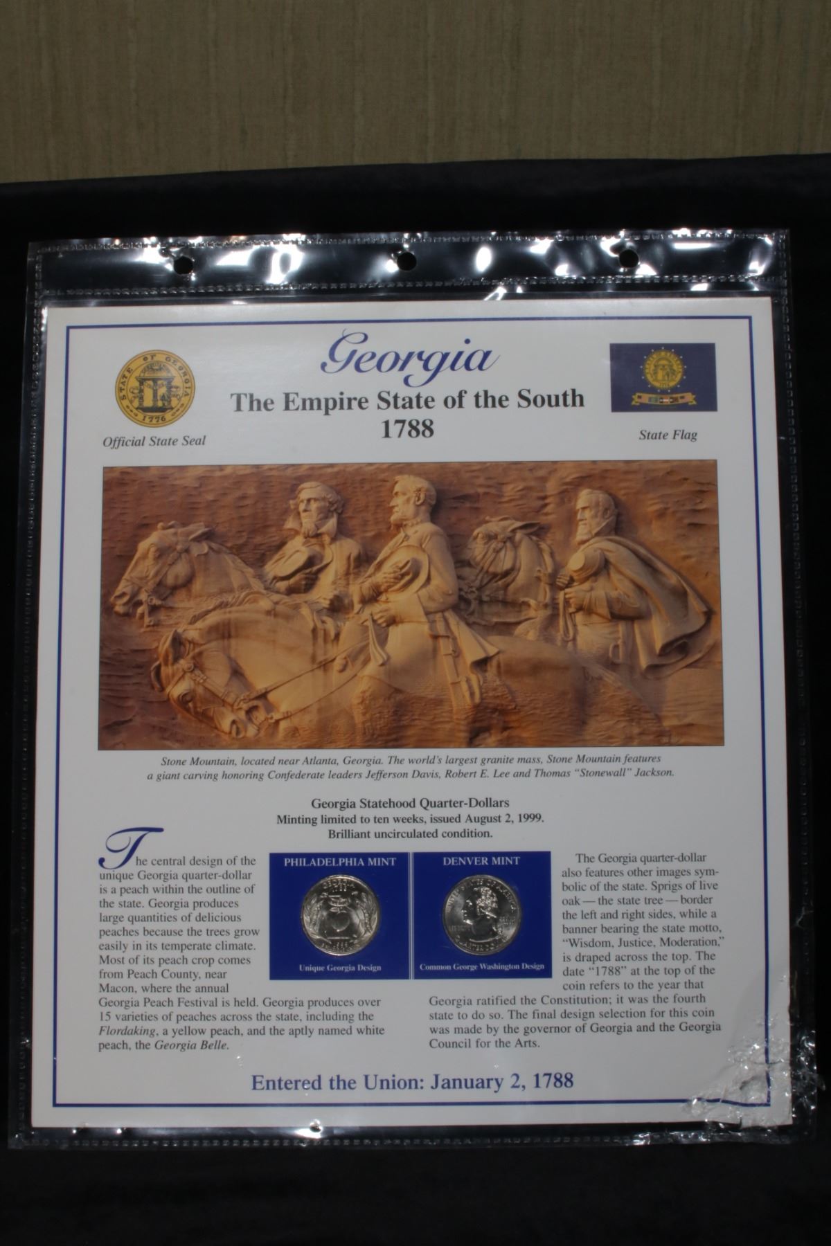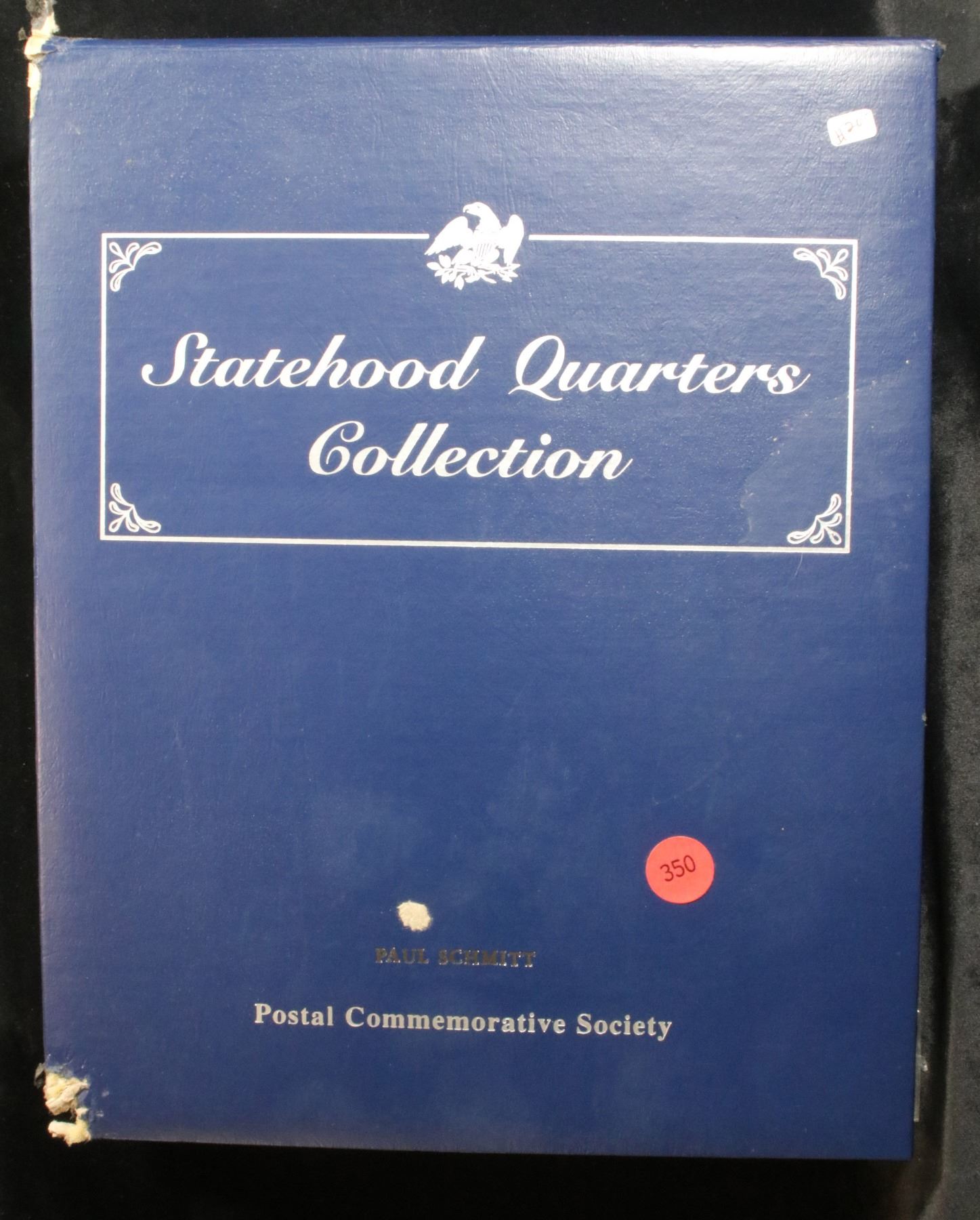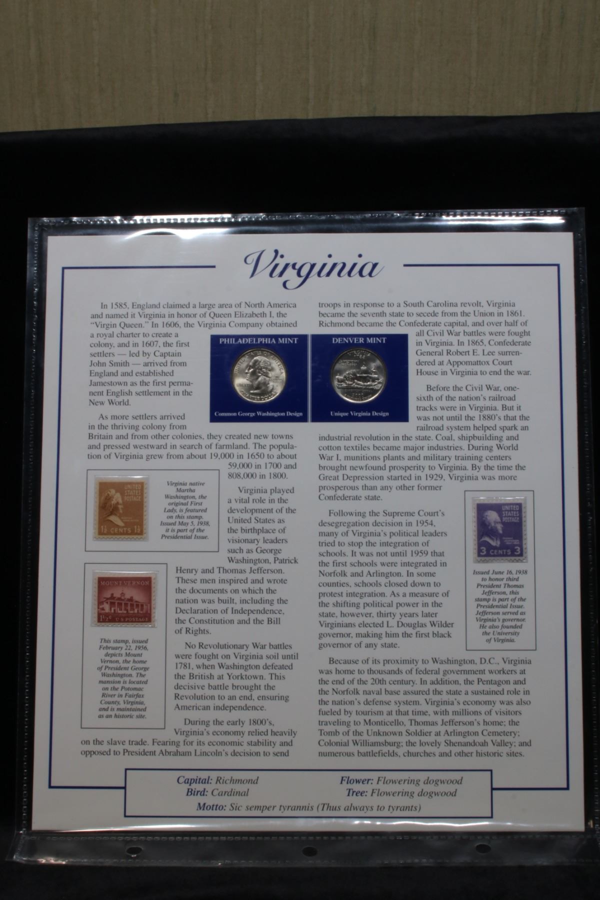 Postal Commemorative Society Statehood Quarters Collection Volume 1. The first half of the Statehood Quarters from the Postal Commemorative Society. Each page is a different state and has both the Philadelphia and Denver issue for that state. Each page has a brief history of the state including the year it was established. This book has 23 of the first 25 states. It is missing Missouri and Arkansas. It includes DE, PA, NJ, GA, CT, MA, MD, SC, NH, VA, N Y, NC, RI, VT, KY, TN, OH, LA, IN, MS, IL, AL, and ME. The book is not perfect. Some of the corners are chewed/tattered. The bottom of the state of Georgia has been chewed.