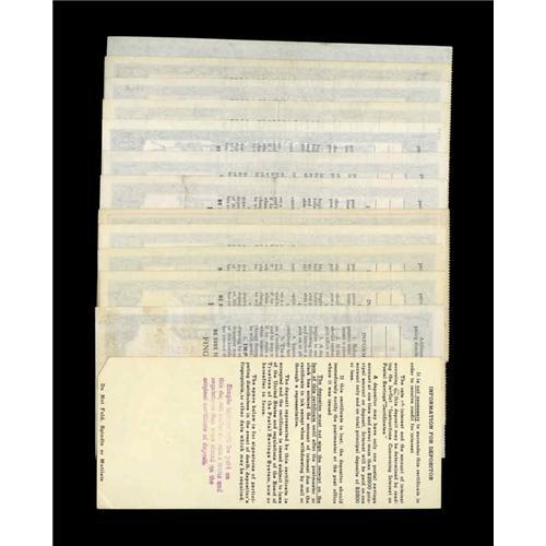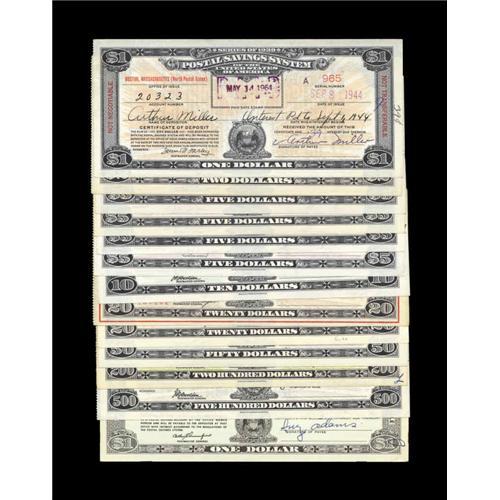 <B>Postal Savings System Series 1939 $1, $2, $5 (4), $10, $20 (2), $50, $100, $200, $500</B></I><BR><B>Postal Savings System Series 1954 $1.</B></I><BR> The Series of 1939 grouping contains a complete denomination set for this series.