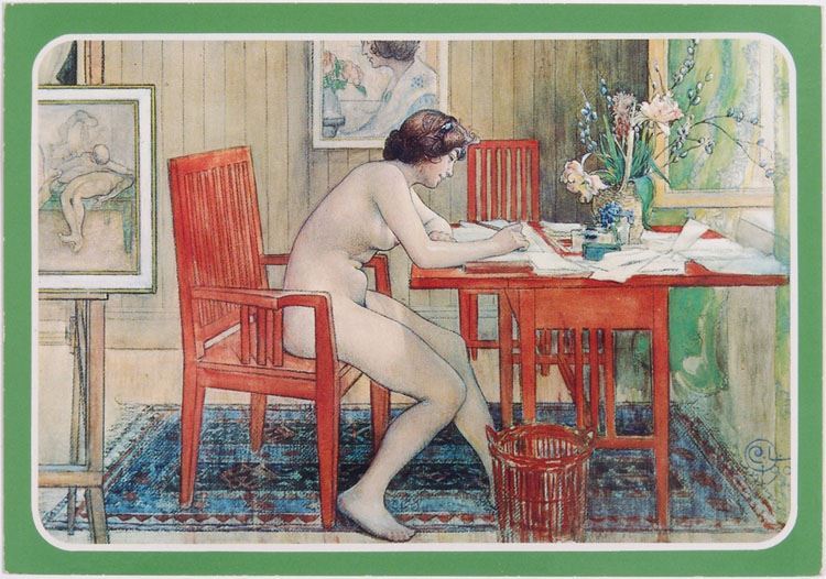 This is a vintage postcard (probably 1980s) featuring 1906 artwork by Swedish artist Carl Larsson titled Modellen Skriver Vykort, Akvarell (Model Writing Postcards, Watercolor). Printed in Italy by Giovanni Trimboli. SIZE: Approx. 6" x 4".