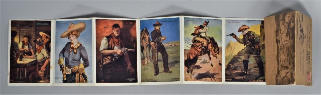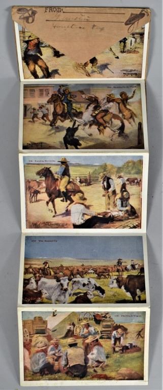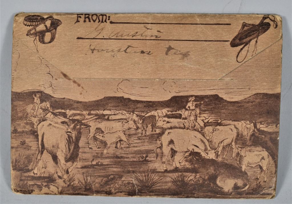 Postcard "Cowboy Life" Souvenir Folder. Cancelled 2 cent was used to mail from Houston, TX to Pittsfield, Mass. Folds out to show front and back 22 different Western Americana images by different artist dating from early 1900.