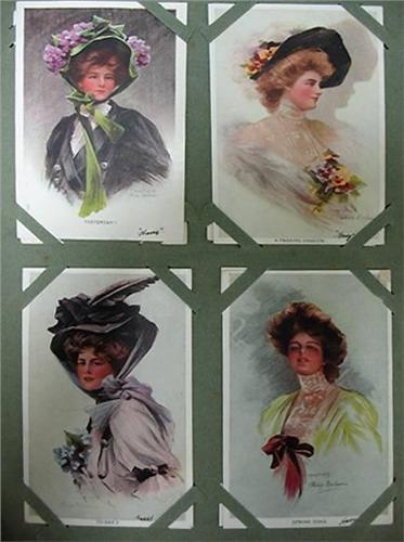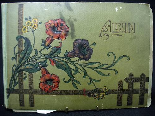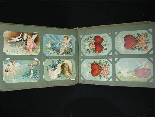 Postcard album C.1900 with holiday cards including New Years; Easter; Christmas; Thanksgiving and Valentines Day; and Philip Boileau portrait cards; town views (American and foreign); birthday and more; approximately 439 cards; album measures 9 1/2" high x 13" across (postcards in very good condition; album in fair condition)