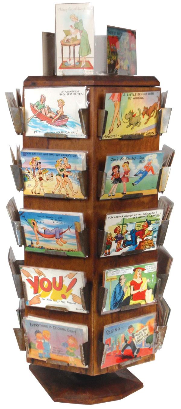 Postcard display, 6-sided revolving wooden counter display w/metal holders, full of 45 1940's-1950's new old stock comical postcards, display in VG cond, postcards are Exc, 28"H x 13"W.